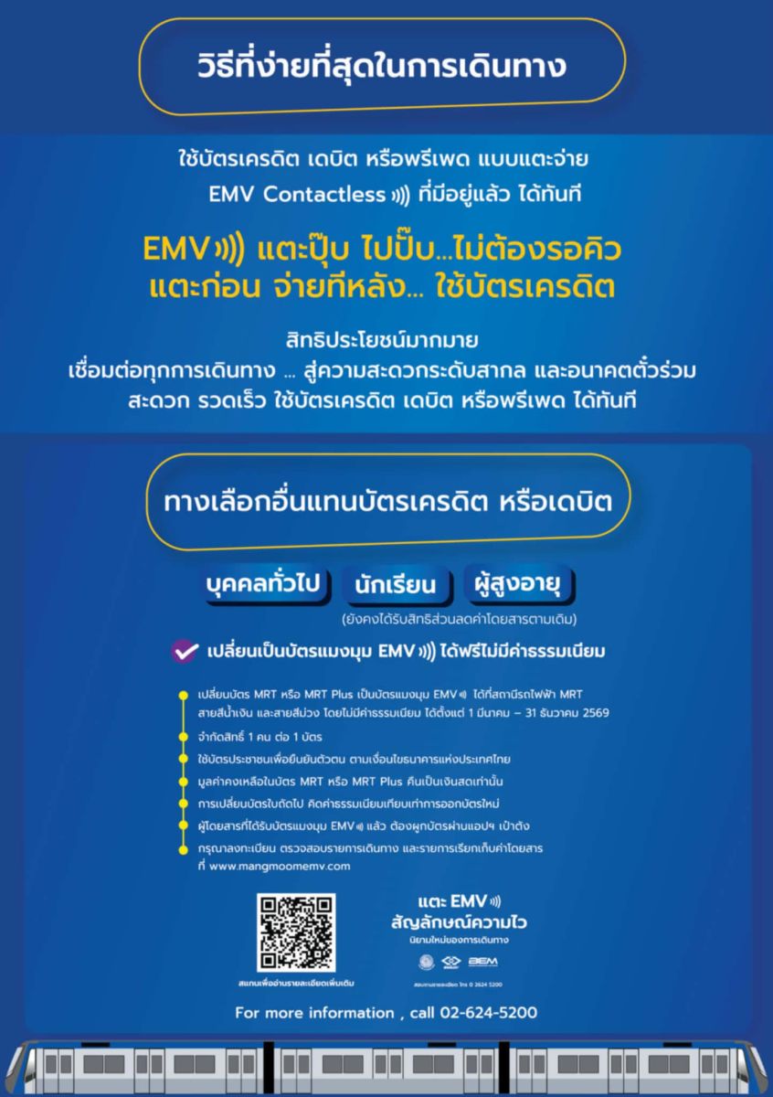 ในวันนี้ กระทรวงคมนาคม รฟม. และ BEM จึงร่วมกันที่จะสื่อสารกับประชาชนผู้ใช้บริการรถไฟฟ้า MRT สายสีน้ำเงิน และสายสีม่วง โดยเฉพาะกลุ่มผู้ใช้บัตรโดยสารแบบเติมเงิน (บัตร MRT/MRT Plus) ในการชำระค่าโดยสารอยู่ในปัจจุบัน ตั้งแต่วันที่ 1 มีนาคม 2569 เป็นต้นไปจนถึงสิ้นปีนี้ ท่านสามารถนำบัตรโดยสารแบบเติมเงินใบเดิมของท่านไปติดต่อเจ้าหน้าที่ที่ห้องออกบัตรโดยสารได้ทุกสถานี เพื่อขอคืนมูลค่าคงเหลือในบัตร (Refund) และหากต้องการทำบัตรแมงมุม EMV สามารถแจ้งเจ้าหน้าที่ได้ทันที เพื่อรับสิทธิ์ยกเว้นค่าธรรมเนียมการออกบัตร หรือ หากท่านมีบัตรเครดิต/เดบิตใดๆ ที่เป็น EMV Contactless อยู่แล้ว ต่อไปท่านสามารถใช้บัตรนั้นๆ แตะเข้าระบบรถไฟฟ้า MRT ได้เลยทุกสาย ทั้งสายสีน้ำเงิน สายสีม่วง สายสีเหลือง และสายสีชมพู แต่สำหรับท่านที่ยังไม่ประสงค์เปลี่ยนไปใช้บัตรมาตรฐาน EMV Contactless โดยทันที เราตั้งกรอบเวลาไว้คือ ตั้งแต่วันที่ 1 เมษายน 2569 เป็นต้นไป ผู้ให้บริการรถไฟฟ้า MRT สายสีน้ำเงิน และสายสีม่วง จะยุติการให้บริการเติมเงินเข้าบัตร MRT/MRT Plus ทุกช่องทาง โดยผู้ถือบัตรยังสามารถใช้มูลค่าเดินทางคงเหลือในบัตรได้จนถึงสิ้นเดือนพฤษภาคม 2569 และเมื่อเข้าสู่วันที่ 1 มิถุนายน 2569 เป็นต้นไป รถไฟฟ้า MRT สายสีน้ำเงิน และสายสีม่วง จะยุติการรับชำระค่าโดยสารด้วยบัตรโดยสารแบบเติมเงินทุกสถานี เป็นการเปลี่ยนผ่านเข้าสู่การเดินทางแบบไร้รอยต่อกับ MRT ด้วย EMV Contactless อย่างเต็มรูปแบบ”