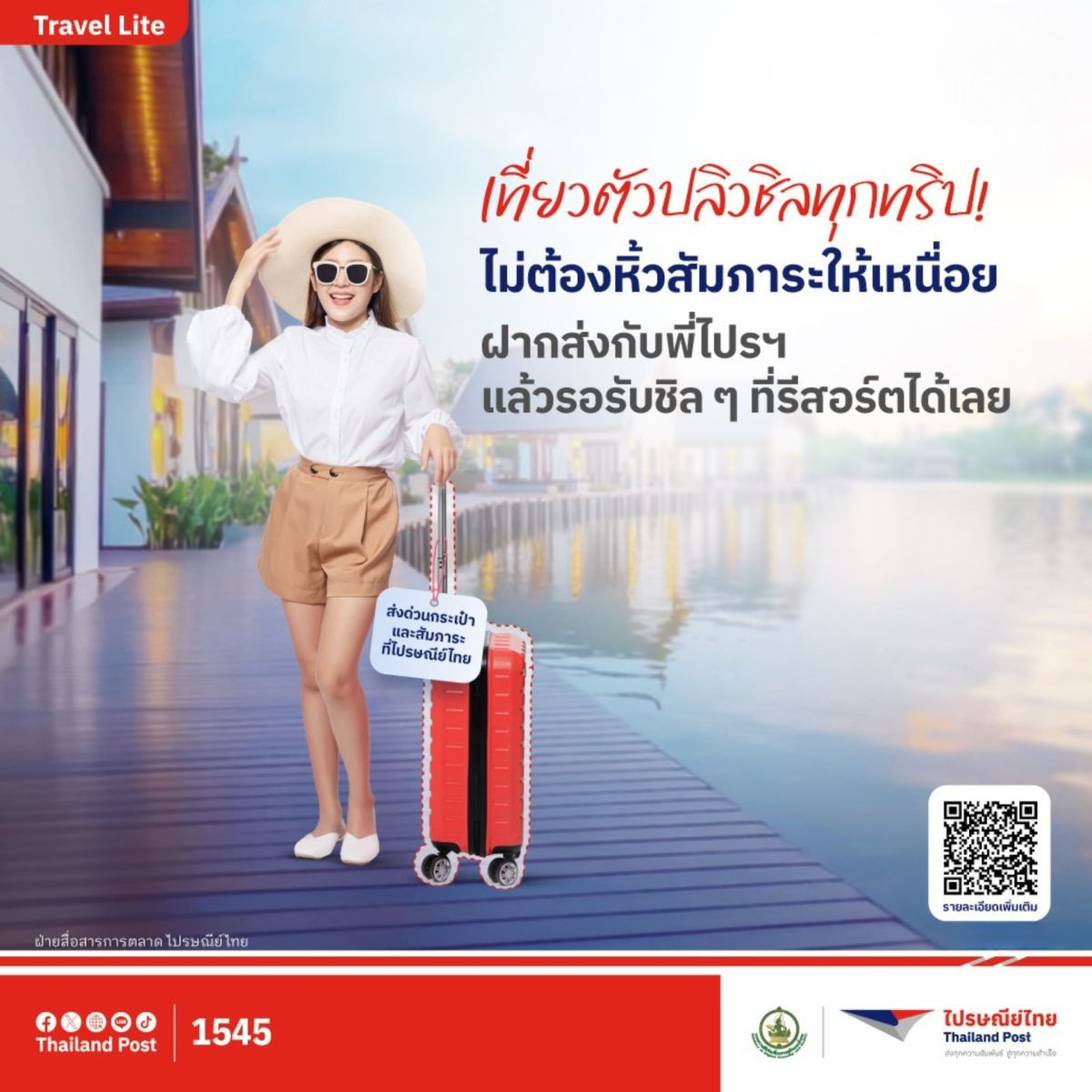 “พี่ไปรฯ” ชวนสายเที่ยวเปลี่ยนจากการลากกระเป๋าพะรุงพะรัง มาเป็นการเดินตัวปลิวตั้งแต่วินาทีแรก ที่ถึงจุดหมาย ด้วยบริการ Travel Lite จากไปรษณีย์ไทย ที่ช่วยจัดส่งสัมภาระล่วงหน้า หรือส่งกลับปลายทาง อย่างสะดวก ปลอดภัย ตรงเวลา เพราะการเที่ยวที่ดีคือความเบาสบายทั้งกายและใจในทุกก้าวของการเดินทาง