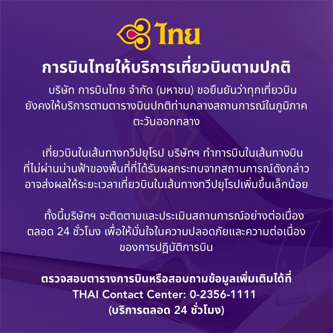ตามที่เกิดสถานการณ์ความไม่สงบในภูมิภาคตะวันออกกลาง บริษัท การบินไทย จำกัด (มหาชน) ขอเรียนว่า เที่ยวบินของบริษัทฯ ยังคงให้บริการตามปกติ และในปัจจุบัน บริษัทฯ ไม่มีเที่ยวบินไปยังภูมิภาคที่เกิดความไม่สงบ