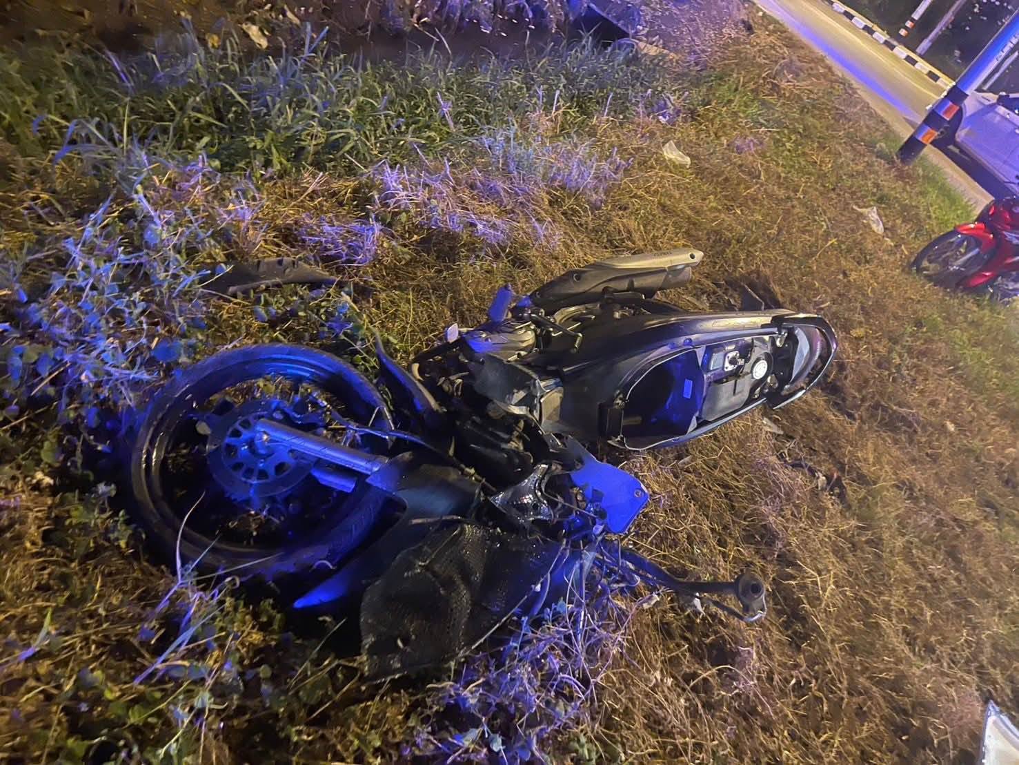 รถนั่งส่วนบุคคลชนกับรถจักรยานยนต์กลางถนน มีผู้บาดเจ็บ 2 รายและเสียชีวิต 1 ราย จ.กาญจนบุรี