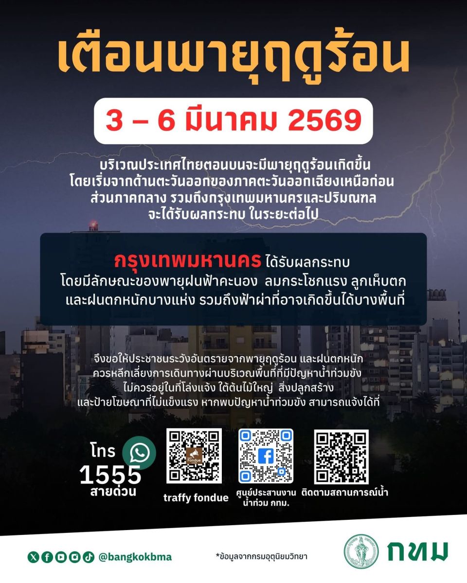ในวันที่ 3-6 มีนาคม 2569 บริเวณประเทศไทยตอนบนจะมีพายุฤดูร้อนเกิดขึ้น โดยเริ่มจากด้านตะวันออกของภาคตะวันออกเฉียงเหนือก่อน ส่วนภาคกลาง รวมถึงกรุงเทพมหานครและปริมณฑล จะได้รับผลกระทบในระยะต่อไป