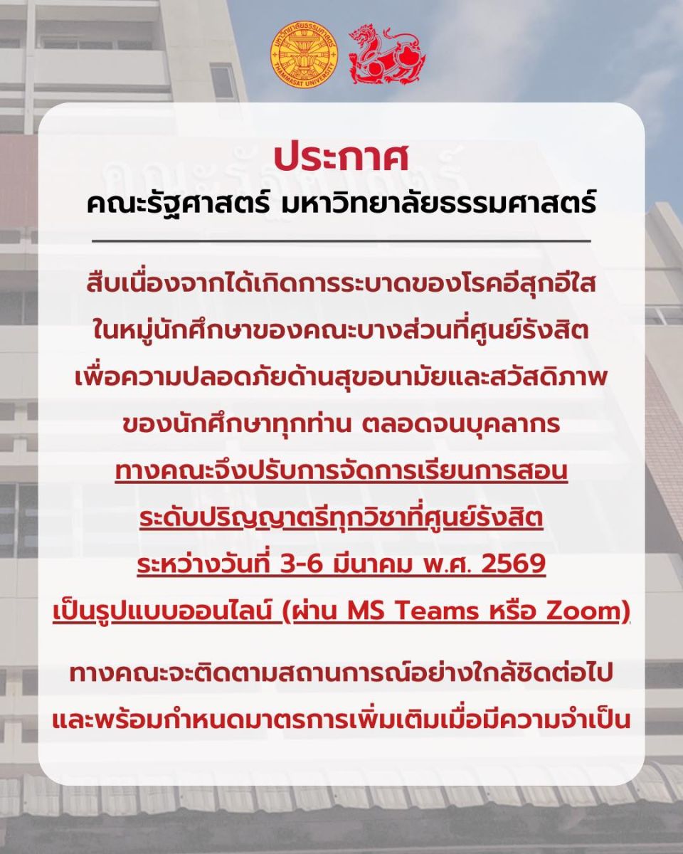 สืบเนื่องจากได้เกิดการระบาดของ โรคอีสุกอีใส ในหมู่นักศึกษาของคณะบางส่วนที่ศูนย์รังสิต เพื่อความปลอดภัยด้านสุขอนามัยและสวัสดิภาพ ของนักศึกษาทุกท่าน ตลอดจนบุคลากร ทางคณะจึงปรับการจัดการเรียนการสอน ระดับปริญญาตรีทุกวิชาที่ศูนย์รังสิต ระหว่างวันที่ 3-6 มีนาคม พ.ศ. 2569 เป็นรูปแบบออนไลน์ (ผ่าน MS Teams หรือ Zoom)ทางคณะจะติดตามสถานการณ์อย่างใกล้ชิดต่อไปและพร้อมกำหนดมาตรการเพิ่มเติมเมื่อมีความจำเป็น