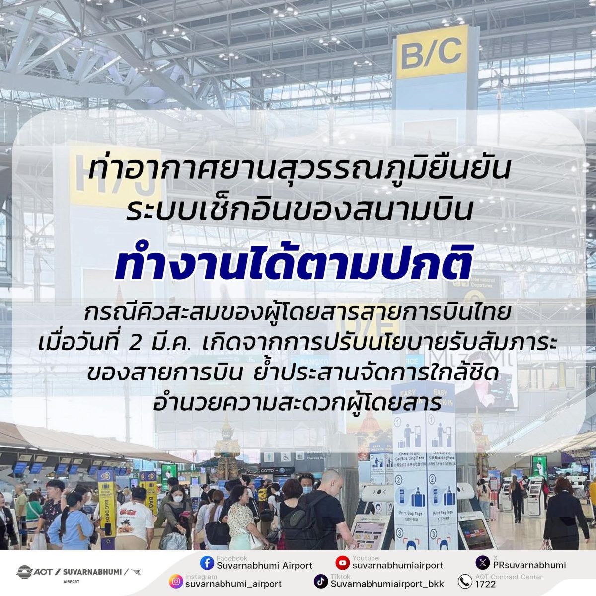 • ท่าอากาศยานสุวรรณภูมิ (ทสภ.) ขอชี้แจงกรณีที่ปรากฏภาพผู้โดยสารสายการบินไทยมีคิวสะสมหนาแน่นบริเวณเคาน์เตอร์เช็กอิน เมื่อวันที่ 2 มีนาคมที่ผ่านมา