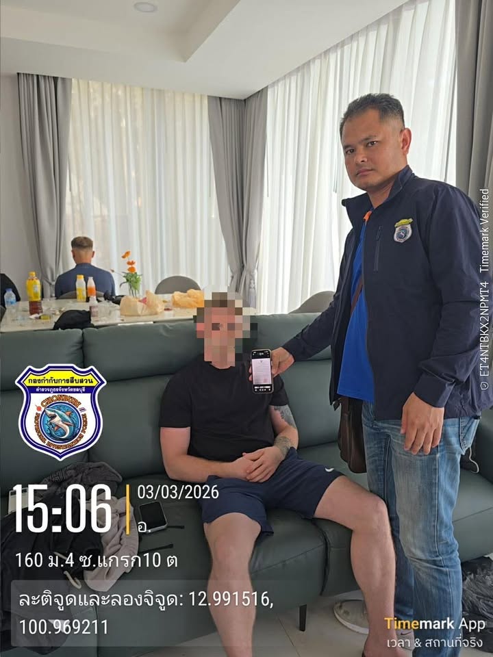 ผู้ต้องหาคือ ชาย อายุ 26 ปี สัญชาติอังกฤษ ตามหมายจับศาลจังหวัดพัทยา ที่ 126/2569 ลงวันที่ 28 กุมภาพันธ์ 2569 ในข้อหา “ร่วมกันปล้นทรัพย์โดยมีอาวุธ และโดยใช้ยานพาหนะเพื่อกระทำผิดหรือเพื่อพาทรัพย์นั้นไป หรือเพื่อให้พ้นการจับกุม” โดยเจ้าหน้าที่เข้าควบคุมตัวได้ที่บ้านพัก ม.4 ต.หนองปลาไหล อ.บางละมุง จ.ชลบุรี