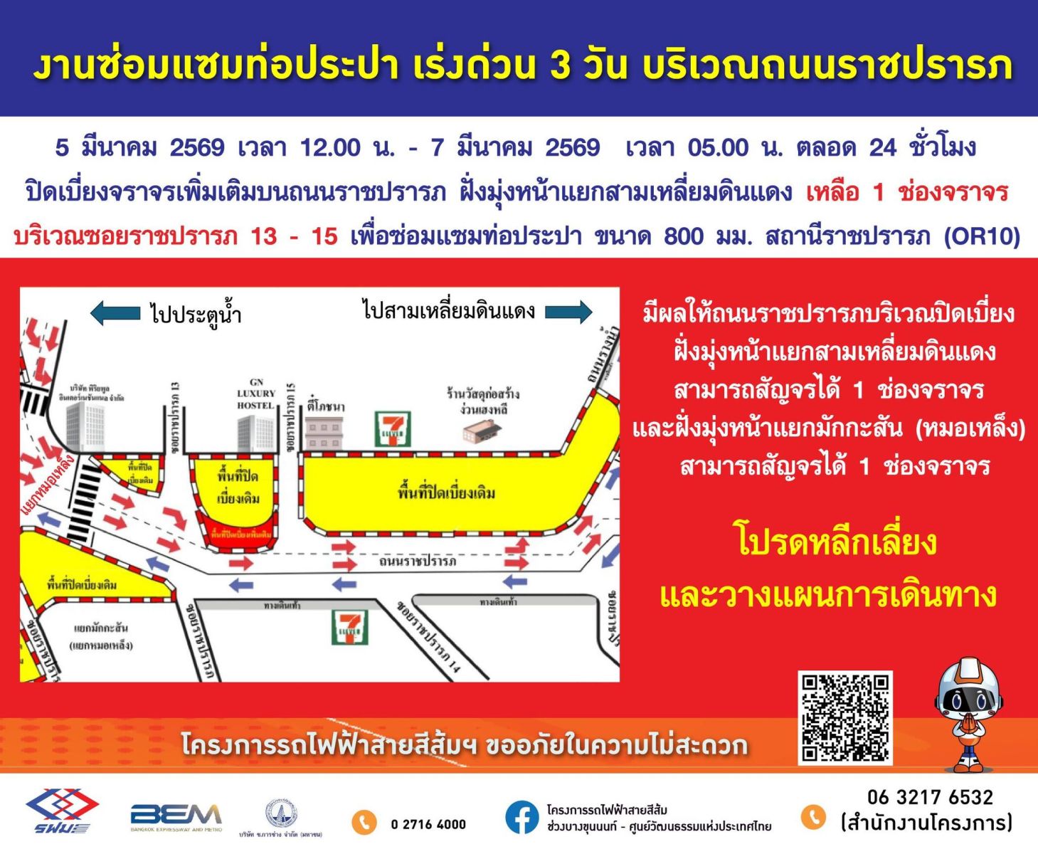 แจ้งประชาสัมพันธ์ งานซ่อมแซมท่อประปา กรณีเร่งด่วน 3 วัน บริเวณถนนราชปรารภ ตั้งแต่วันที่ 5 มีนาคม 2569 เวลา 12.00 น. - 7 มีนาคม 2569 เวลา 05.00 น. ตลอด 24 ชั่วโมง ปิดเบี่ยงจราจรเพิ่มเติมบนถนนราชปรารภ ฝั่งมุ่งหน้าแยกสามเหลี่ยมดินแดง เหลือ 1 ช่องจราจร