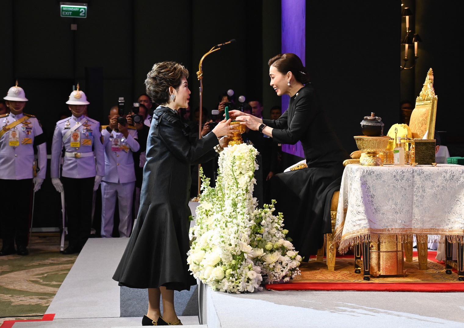 จากนั้นเสด็จเข้าห้องแกรนด์บอลรูมพระราชทานพระราชวโรกาสให้ คณะกรรมการสหพันธ์สมาคมสตรีนักธุรกิจและวิชาชีพแห่งประเทศไทยในพระบรมราชินูปถัมภ์ และคณะกรรมการเครือข่ายผู้ประกอบการสตรีอาเซียน ประเทศไทย (AWEN Thailand) เข้าเฝ้าฯ ทูลเกล้าฯ ถวายรางวัลเข็มเกียรติคุณ สูจิบัตร หนังสือ และของที่ระลึก และพระราชทานพระราชวโรกาสให้ คุณหญิงณัฐิกา วัธนเวคิน อังอุบลกุล กราบบังคมทูลรายงานความเป็นมาและวัตถุประสงค์ของการจัดงาน ฯ และขอพระราชทานพระราชานุญาตกราบบังคมทูลเบิกผู้ให้การสนับสนุนการจัดงาน ฯ เข้าเฝ้าฯ รับพระราชทานรางวัลเข็มเกียรติคุณ “สสธวท...สตรีทรงพลัง” และเบิกผู้เข้าเฝ้าฯ รับพระราชทานโล่เกียรติคุณ พร้อมทั้งขอรับพระราชทานพระราชดำรัส ตามลำดับ