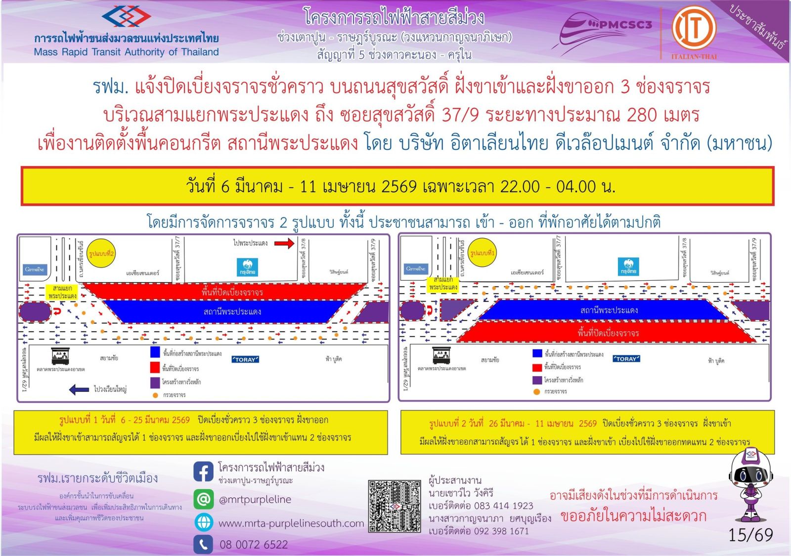 การรถไฟฟ้าขนส่งมวลชนแห่งประเทศไทย (รฟม.) แจ้งว่า บริษัท อิตาเลียนไทย ดีเวล๊อปเมนต์ จำกัด (มหาชน) ผู้รับจ้างงานก่อสร้างทางวิ่งและสถานียกระดับ อาคารจอดรถไฟฟ้าและอาคารจอดแล้วจร โครงการรถไฟฟ้าสายสีม่วง ช่วงเตาปูน - ราษฎร์บูรณะ (วงแหวนกาญจนาภิเษก) สัญญาที่ 5 ช่วงดาวคะนอง - ครุใน มีความจำเป็นต้องปิดเบี่ยงจราจรชั่วคราว บนถนนสุขสวัสดิ์ ฝั่งขาเข้าและขาออก 3 ช่องจราจร บริเวณสามแยกพระประแดง ถึง ซอยสุขสวัสดิ์ 37/9 ระยะทางประมาณ 280 เมตร เพื่องานติดตั้งพื้นคอนกรีต สถานีพระประแดง ในวันที่ 6 มีนาคม - 11 เมษายน 2569 เฉพาะเวลา 22.00 - 04.00 น. โดยมีการจัดการจราจร 2 รูปแบบ ดังนี้