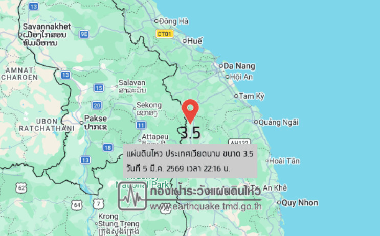 วันที่ 5 มี.ค. 2569 เวลา 22.16 น. กองเฝ้าระวังแผ่นดินไหว กรมอุตุนิยมวิทยา แจ้งเหตุ แผ่นดินไหว ขนาด 3.5 ความลึก 10 กม. ภายในพื้นที่ของประเทศเวียดนาม (15.09°N,107.68°E) ศูนย์กลางห่างออกไปทางทิศตะวันออกเฉียงใต้ของ อ.เมือง จ.อุบลราชธานี ประมาณ 304 กม. ยังไม่มีรายงานผลกระทบต่อประเทศไทย