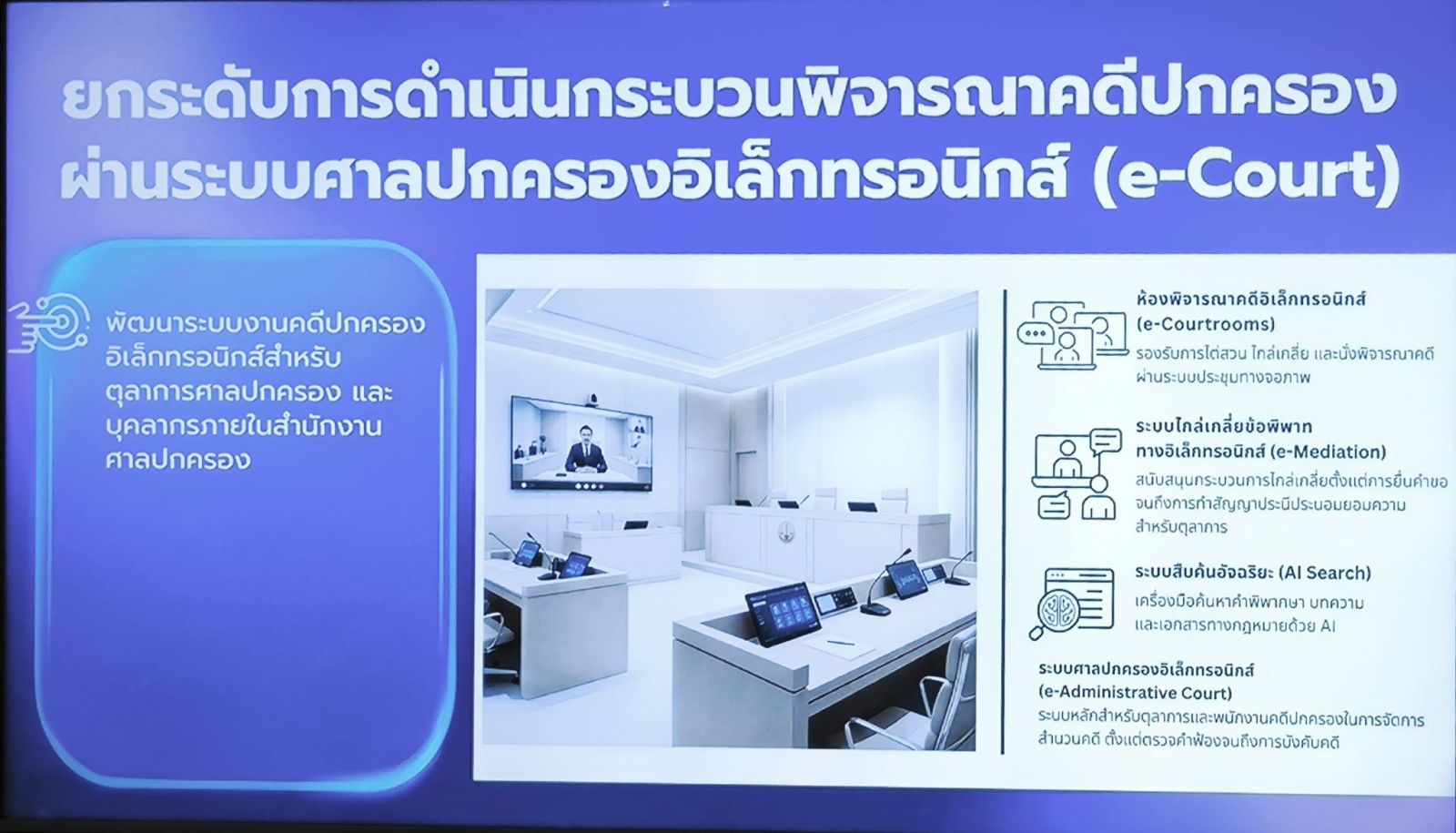 นอกจากนี้ ยังได้ยกระดับการดำเนินกระบวนพิจารณาคดีปกครองผ่านระบบศาลปกครองอิเล็กทรอนิกส์ (e-Court) เพื่อให้ประชาชนได้รับความยุติธรรมที่สะดวกและรวดเร็ว โดยพัฒนาระบบงานคดีปกครองอิเล็กทรอนิกส์สำหรับตุลาการศาลปกครองและบุคลากรภายในสำนักงานศาลปกครอง เพื่อสนับสนุนการดำเนินกระบวนพิจารณาคดีในรูปแบบอิเล็กทรอนิกส์อย่างครบถ้วน ตั้งแต่ชั้นตรวจคำฟ้องจนถึงชั้นบังคับคดีเพื่อให้คู่กรณีสามารถยื่นคำร้องและคำขอต่าง ๆ ในชั้นบังคับคดีผ่านช่องทางออนไลน์ได้สะดวกยิ่งขึ้น รวมถึงพัฒนาระบบไกล่เกลี่ยข้อพิพาททางอิเล็กทรอนิกส์ (e-Mediation) โดยสนับสนุนกระบวนการไกล่เกลี่ย ตั้งแต่การยื่นคำขอจนถึงการทำสัญญาประนีประนอมยอมความผ่านระบบดิจิทัล และระบบบังคับคดีอิเล็กทรอนิกส์ (e-Execution) รวมไปถึงการปรับเปลี่ยนองค์กรสู่สำนักงานอิเล็กทรอนิกส์ (e-Office) อย่างเต็มรูปแบบ เพื่อเพิ่มประสิทธิภาพการบริหารจัดการภายใน ลดต้นทุนทรัพยากร และสร้างวัฒนธรรมการทำงานที่ทันสมัย ภายใต้แนวคิดองค์กรไร้กระดาษ (Paperless) ซึ่งการพัฒนาระบบดังกล่าวไม่เพียงแต่ช่วยลดต้นทุนและระยะเวลาในการทำงาน แต่ยังเป็นรากฐานสำคัญในการสร้างวัฒนธรรมการทำงานที่คล่องตัว และพร้อมรับการเปลี่ยนแปลงเพื่อก้าวไปสู่การเป็นศาลปกครองอิเล็กทรอนิกส์ (e-Admincourt) ในอนาคตอันใกล้