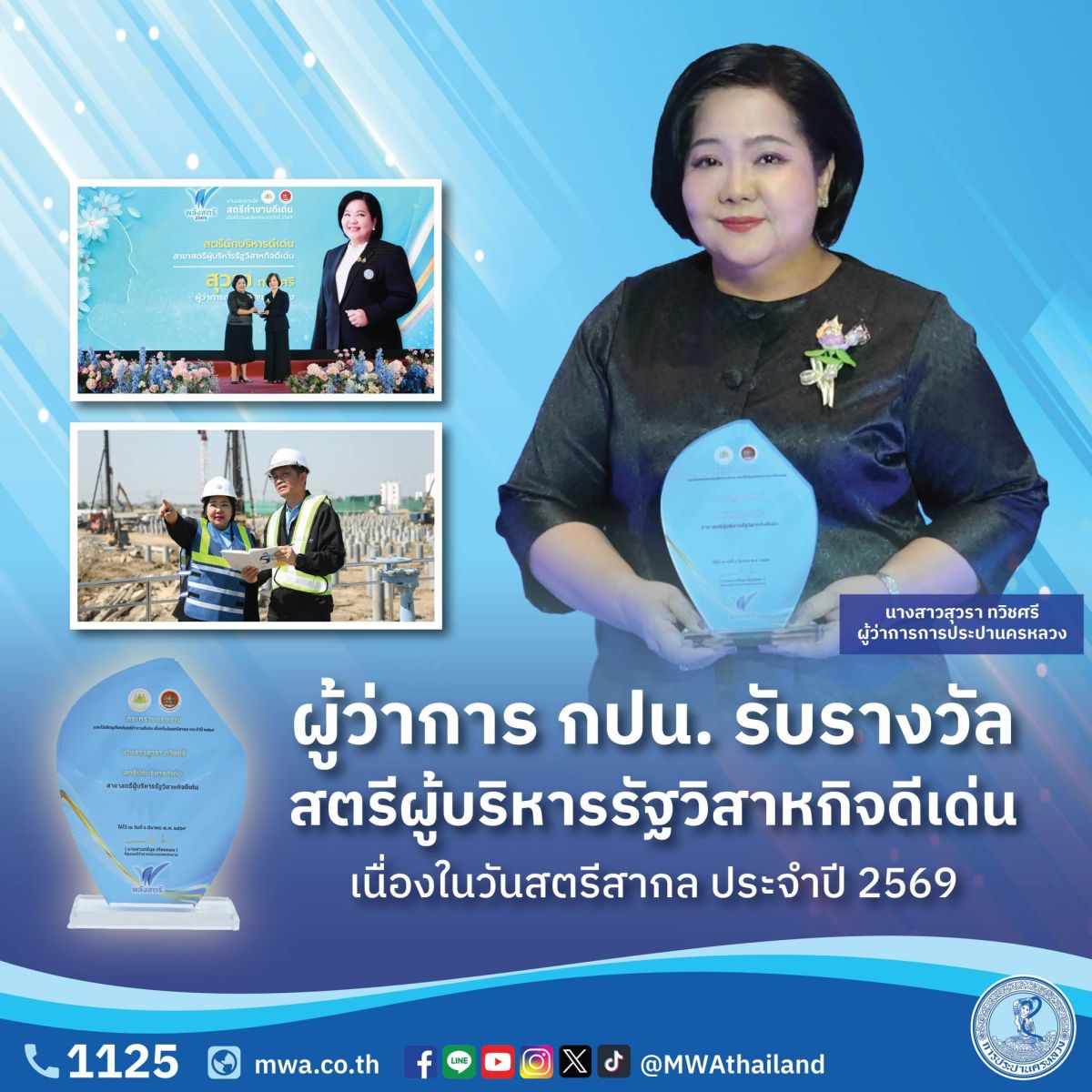 เมื่อวันที่ 6 มีนาคม 2569 ณ โรงแรมมิราเคิล แกรนด์ คอนเวนชั่น นางสาวสุวรา ทวิชศรี ผู้ว่าการการประปานครหลวง (กปน.) รับรางวัลสตรีนักบริหารดีเด่น สาขาสตรีผู้บริหารรัฐวิสาหกิจดีเด่น ในงานพิธีมอบรางวัล “สตรีทำงานดีเด่น เนื่องในวันสตรีสากล ประจำปี 2569” ภายใต้แนวคิด “พลังสตรี วิถีทันสมัย พัฒนาเศรษฐกิจแรงงานไทย ก้าวไปอย่างยั่งยืน” โดยมี นางสาวตรีนุช เทียนทอง รัฐมนตรีว่าการกระทรวงแรงงาน เป็นประธานในพิธีและมอบรางวัลฯ ซึ่งมี 33 สตรีทำงานดีเด่นจากหลากหลายสาขา รวม 11 ประเภทรางวัล เพื่อเชิดชูเกียรติและสร้างแรงบันดาลใจแก่สตรีทั่วประเทศ