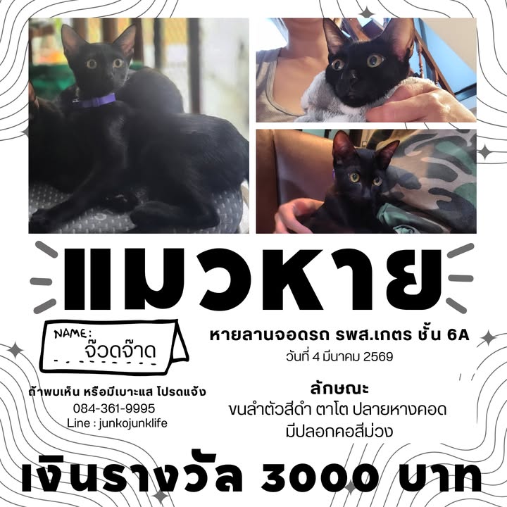 ตามหา "จ๊วดจ๊าด" แมวเพศผู้ ขนลำตัวสีดำ ตาโต ปลายหางขอด มีปลอกคอสีม่วง