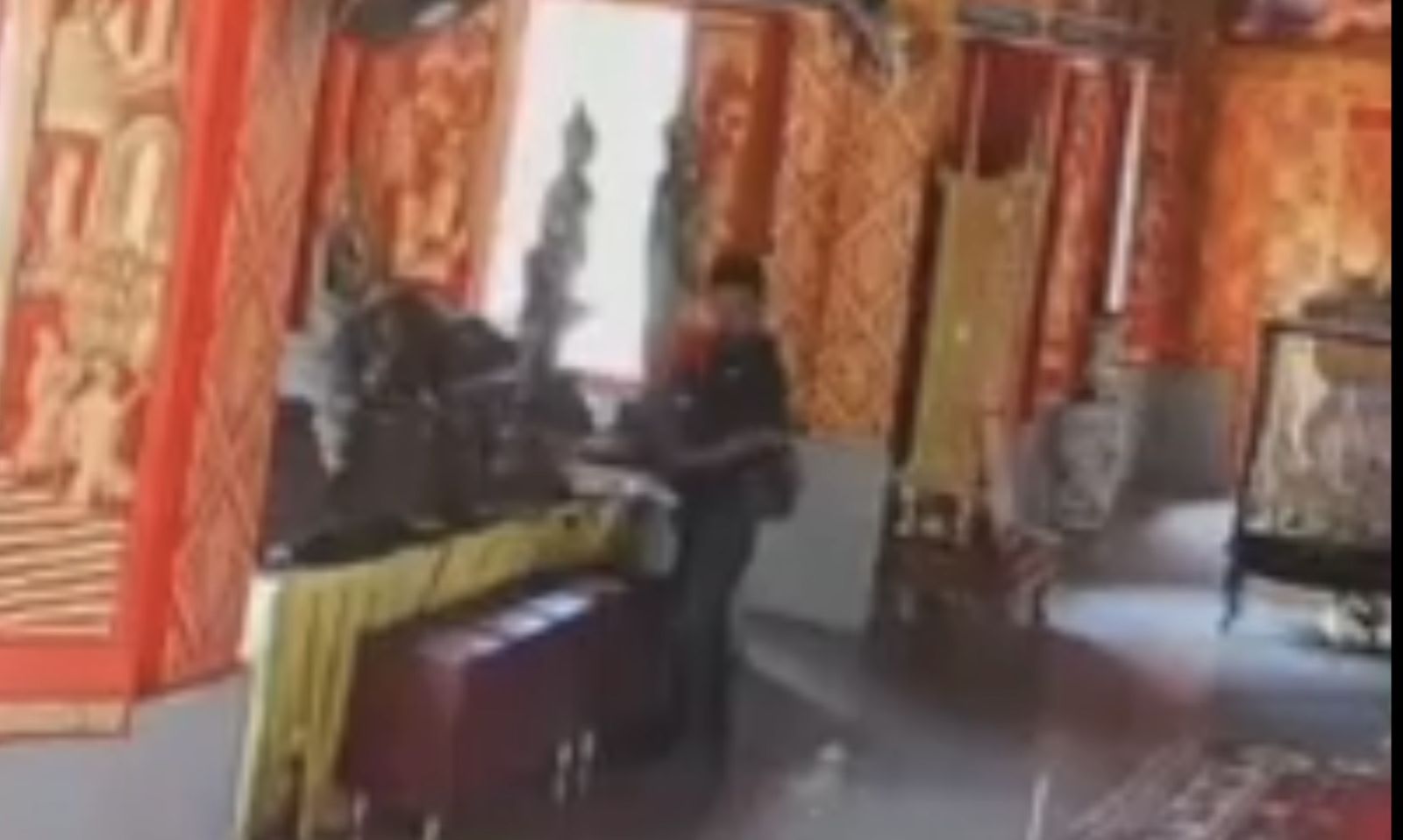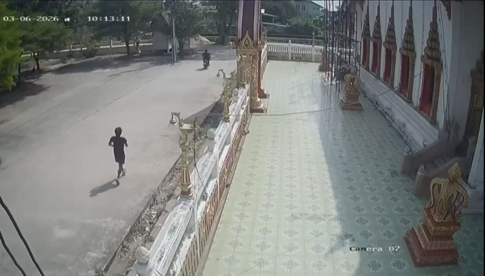 ภาพวงการปิดได้บันทึกภาพชายใส่เสื้อสีดำแขนสั้นกางเกงขายาวสีดำ ขับรถจักรยานยนต์เข้ามาแล้วจอดจากนั้นเดินเข้าไปในวิหารงัดตู้บริจาค ก่อนหลบหนีไป