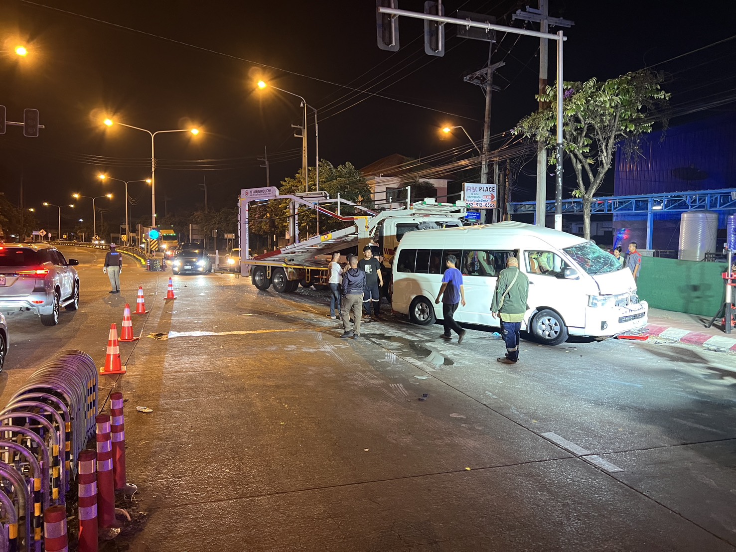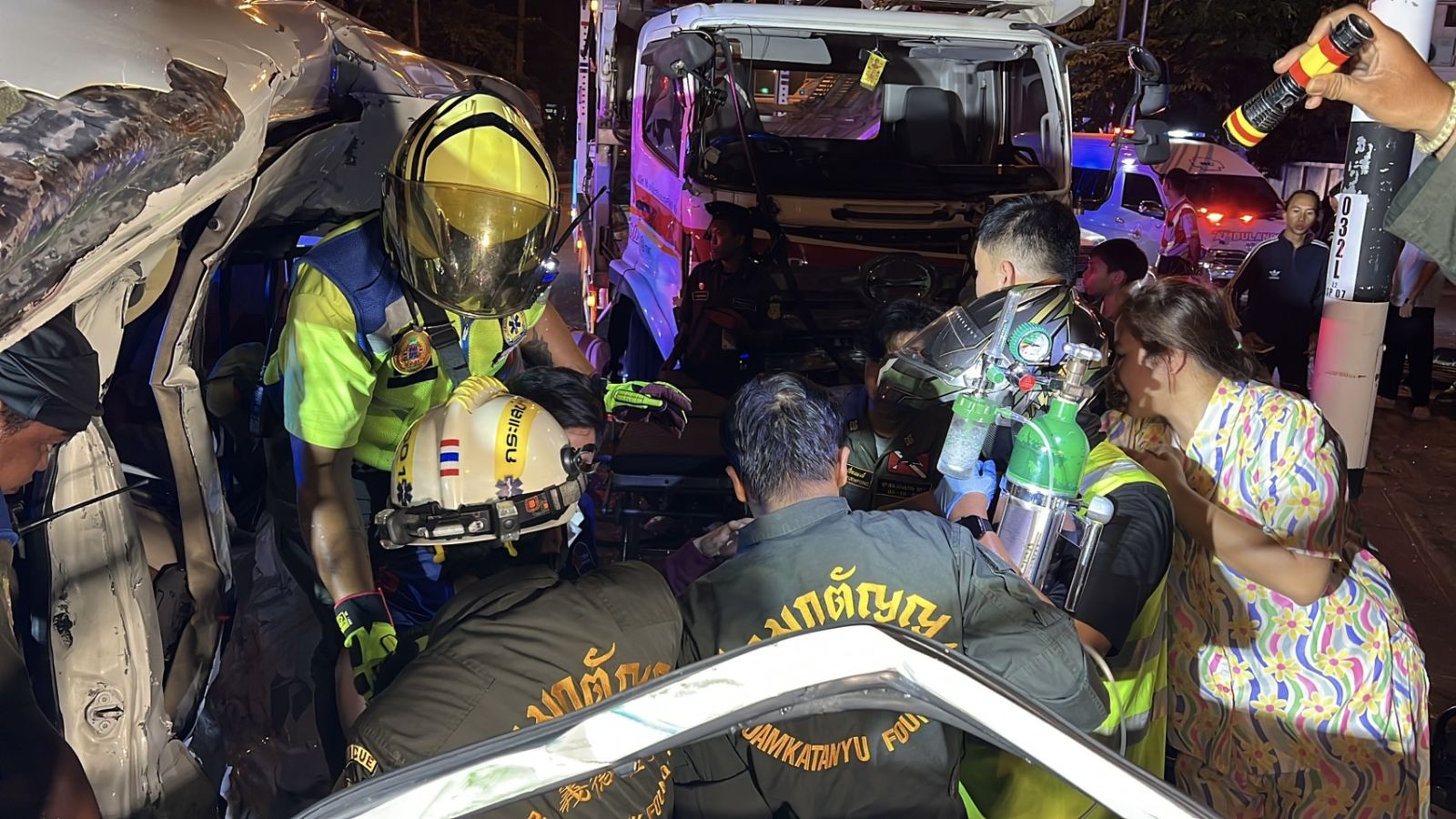 ที่เกิดเหตุบริเวณกลางสี่แยกไฟแดง พบผู้บาดเจ็บเป็นชาย 5 ราย และหญิง 5 ราย รวมจำนวน 10 ราย ทั้งหมดโดยสารมากับรถตู้ ยี่ห้อโตโยต้า สีขาว ทะเบียน 421 กทม. กู้ภัยเร่งลำเลียงเคลื่อนย้ายนำส่งโรงพยาบาลอย่างเร่งด่วน โดย 1 ในนั้นเป็นหญิง 1 คนที่ถูกคอนโซลหน้ารถกดทับบริเวณขาติดอยู่ในรถ เจ้าหน้าที่กู้ภัยเร่งใช้อุปกรณ์เครื่องตัด-ถ่าง ช่วยเหลือนำตัวออกมาได้ก่อนที่จะส่งให้ทีมกู้ชีพโรงพยาบาลชลประทาน ดำเนินการต่อ ส่วนคู่กรณีเป็นรถบรรทุก 10 ล้อยี่ห้อ ฮีโน่ ทะเบียน 6282 กทม. สภาพหน้ารถพังเสียหายยับเยิน