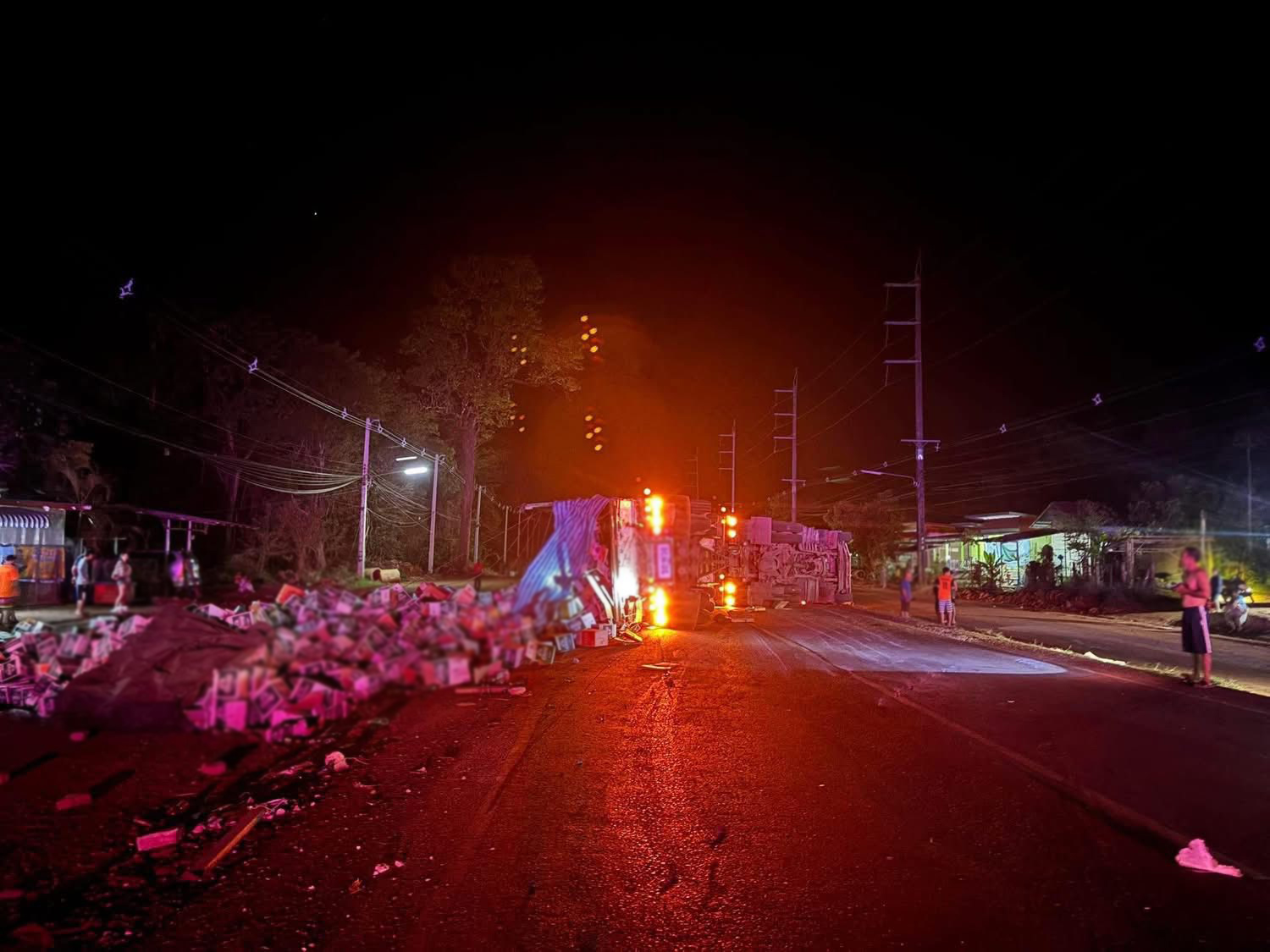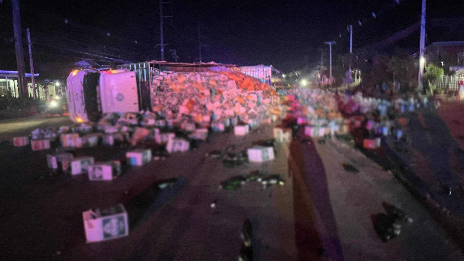 เวลา 00.50 น. (11 มี.ค.) สภ.วานรนิวาส เพิ่มเติมว่า ที่เกิดเห เป็นรถพ่วงบรรทุกขวดแก้วเปล่า ขณะเกิดเจ้าหน้าที่ดำเนินเก็บกวาดเศษลัง - ขวดแล้ว เหลือเพียงรถพ่วงที่พลิกตะแคง โดยเจ้าหน้าที่วางกรวยสัญญาณป้องกันเหตุซ้ำซ้อน จะดำเนินการเคลื่อนย้ายในช่วงเช้า การจราจรผ่านทางได้ 1 เลน