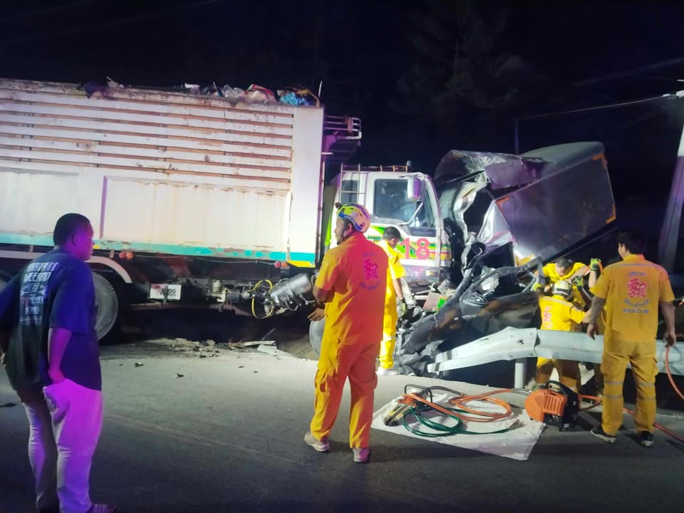 กระบะตู้ทึบเสียหลักแหกโค้งพุ่งชนประสานงากับรถเก็บขยะของเทศบาลอย่างจัง รถพังยับ คนขับกระบะติดคาซากรถเสียชีวิตคาที่ ขณะที่คนขับรถขยะได้รับบาดเจ็บ เจ้าหน้าที่กู้ภัยใช้เครื่องตัดถ่างนานกว่า 1 ชั่วโมงนำร่างออกจากซากรถ