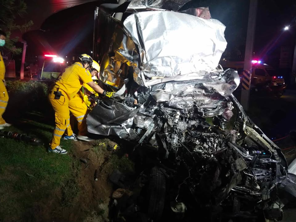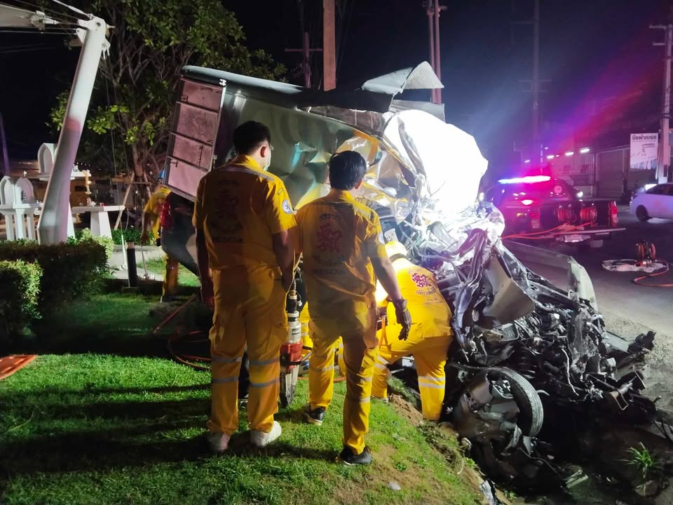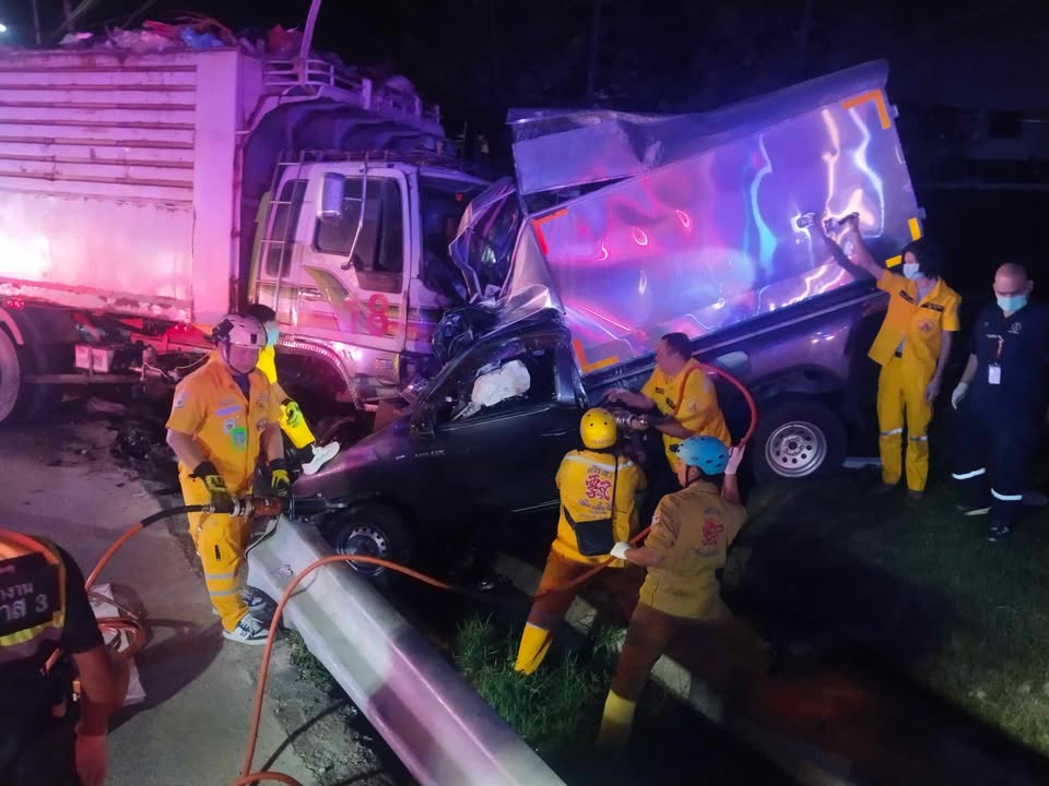 เมื่อเวลา 05.00 น. วันที่ 11 มีนาคม 2569 ศูนย์วิทยุหน่วยกู้ภัยเพียวเยี้ยงไท้ศรีราชา อำเภอศรีราชา จังหวัดชลบุรี ได้รับแจ้งเกิดอุบัติเหตุรถกระบะตู้ทึบเสียหลักแหกโค้งพุ่งชนประสานงากับรถเก็บขยะ บนถนนชุมชนหนองหว้า หมู่ 8 ตำบลบึง อำเภอศรีราชา จังหวัดชลบุรี โดยมีผู้เสียชีวิตติดคาซากรถ หลังรับแจ้งจึงประสานกำลังอาสาสมัครพร้อมอุปกรณ์ตัดถ่างเร่งรัดไปตรวจสอบ