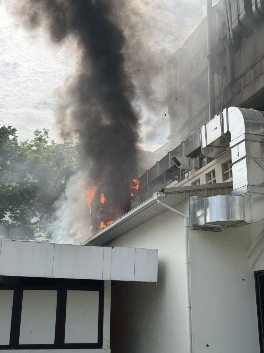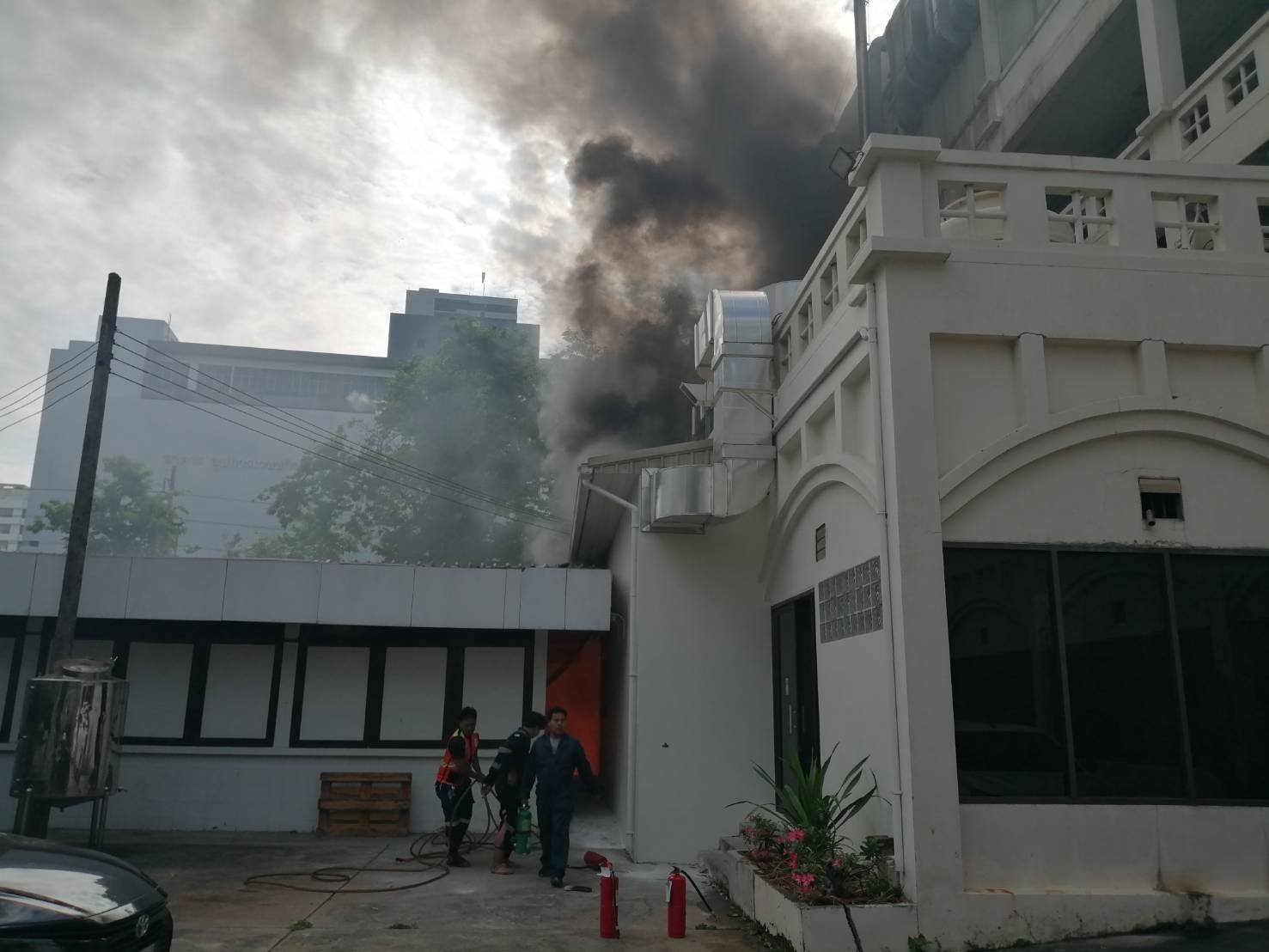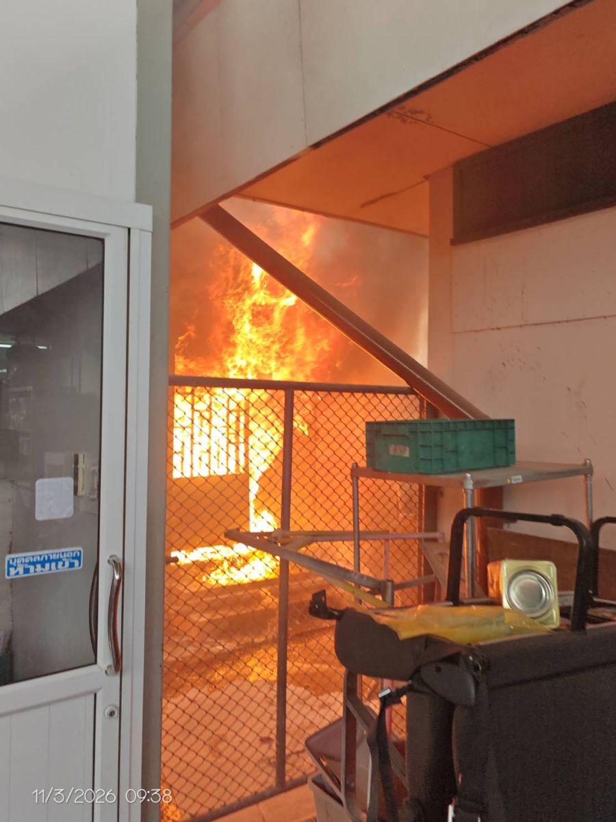 เวลา 09.58 น. ตรวจสอบเบื้องต้นเป็นเพลิงลุกไหม้ชั้นที่ 1 ลุกลามชั้นที่ 2 ภายในห้องเก็บถังน้ำมัน และถังแก๊ส อาคารขณะนี้แสงเพลิงหมดไป เจ้าหน้าที่ทำการวางหัวด้านหลัง จำนวน 2 หัวฉีด เพื่อสกัดกั้นการติดต่อลุกลาม