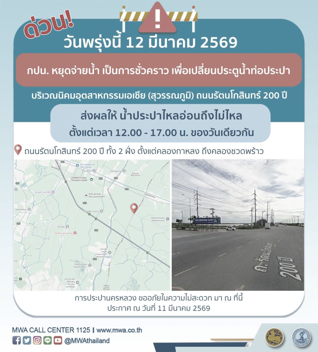 การประปานครหลวง (กปน.) ขอแจ้งให้ทราบว่า จะดำเนินการเปลี่ยนประตูน้ำท่อประปา ในพื้นที่บริเวณนิคมอุตสาหกรรมเอเซีย (สุวรรณภูมิ) ถนนรัตนโกสินทร์ 200 ปี เพื่อให้ประชาชนได้รับบริการน้ำประปาอย่างเพียงพอและทั่วถึง จึงมีความจำเป็นต้องหยุดจ่ายน้ำ เป็นการชั่วคราว ในวันพรุ่งนี้ (วันพฤหัสบดีที่ 12 มีนาคม 2569) ตั้งแต่เวลา 12.00 - 17.00 น. ของวันเดียวกัน โดยระหว่างดำเนินการ ส่งผลให้ น้ำประปาไหลอ่อนถึงไม่ไหล ในพื้นที่ดังต่อไปนี้