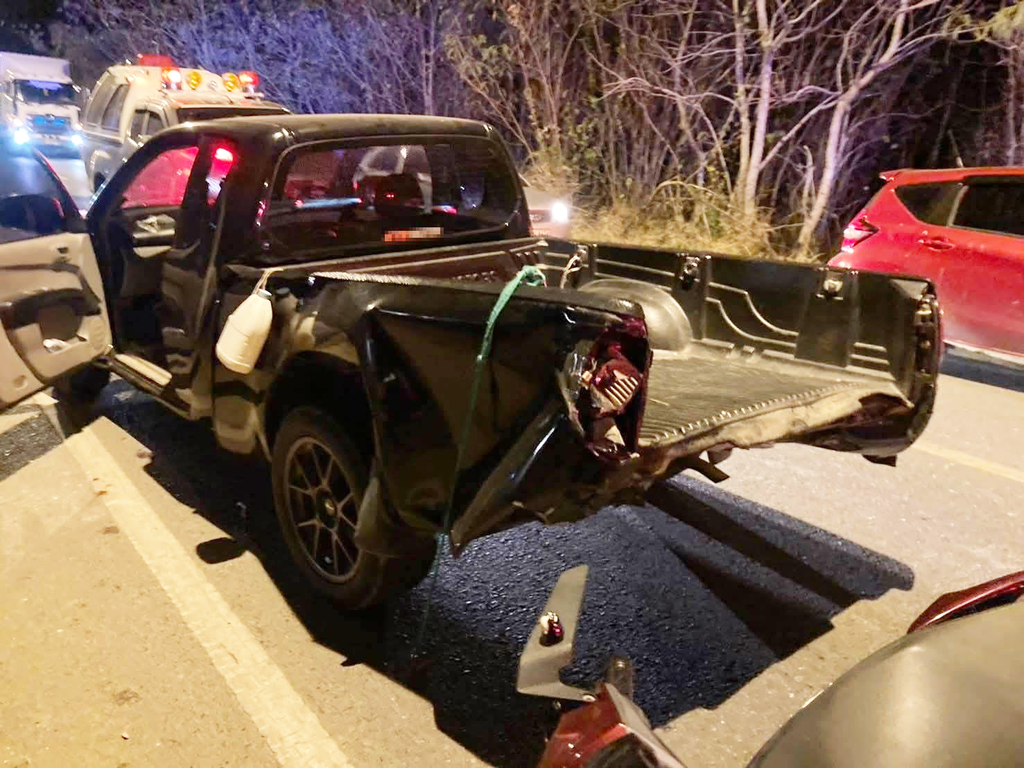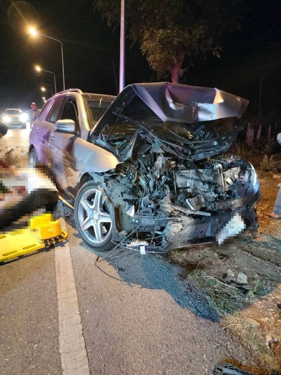 ที่เกิดเหตุ พบรถนั่งส่วนบุคคล เบนซ์ สีเทา ป้ายทะเบียน กทม. สภาพหน้ารถพังเสียหาย ใกล้กัน พบรถกระบะ มิตซูบิชิ ไทรทัน สีดำ ป้ายทะเบียน สระบุรี สภาพด้านท้ายรถพังเสียหาย