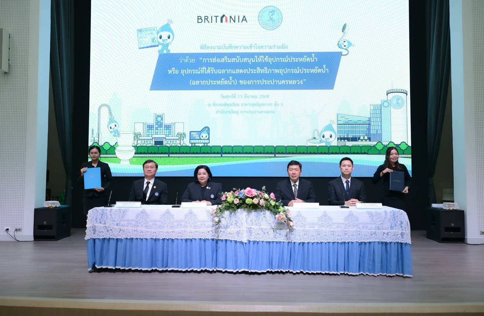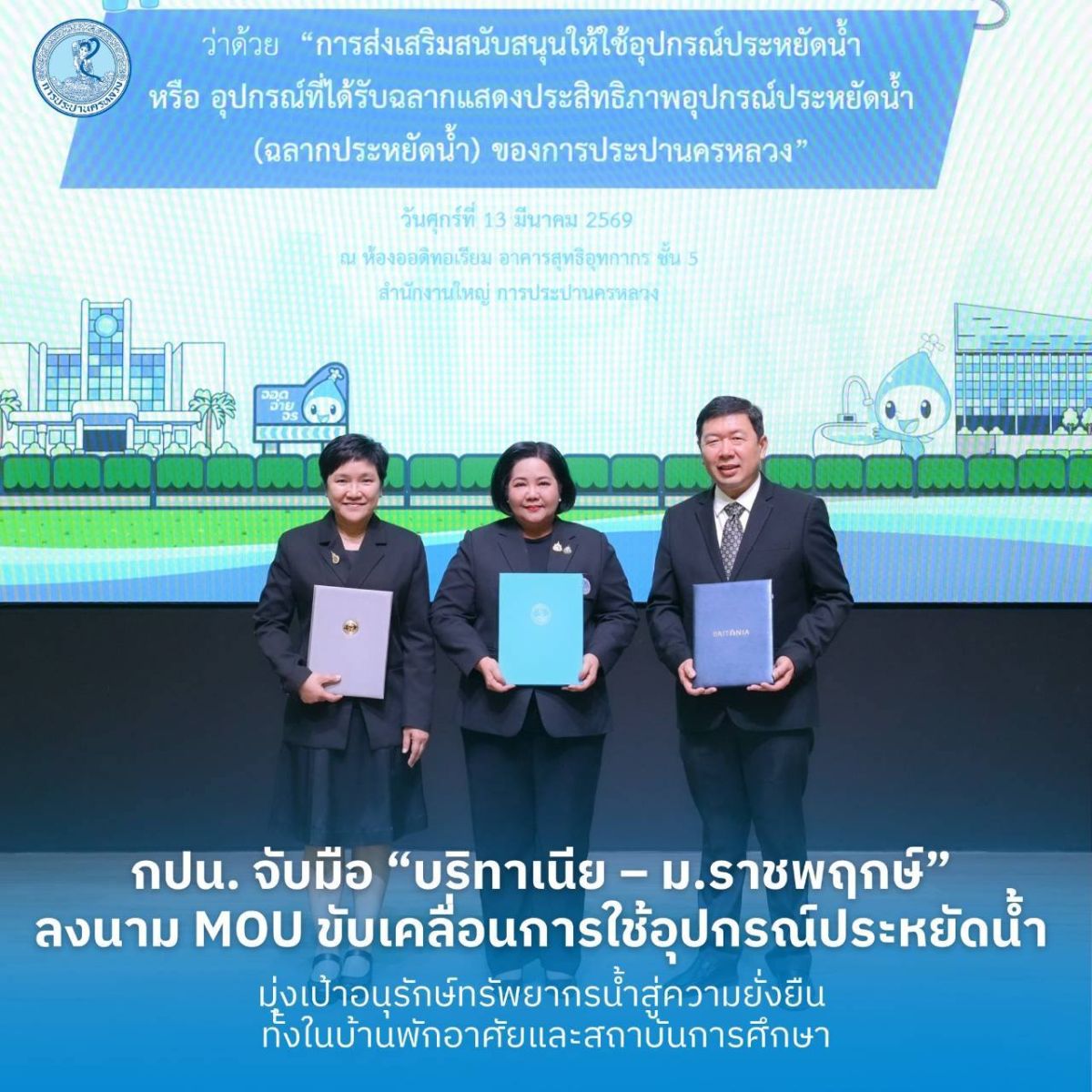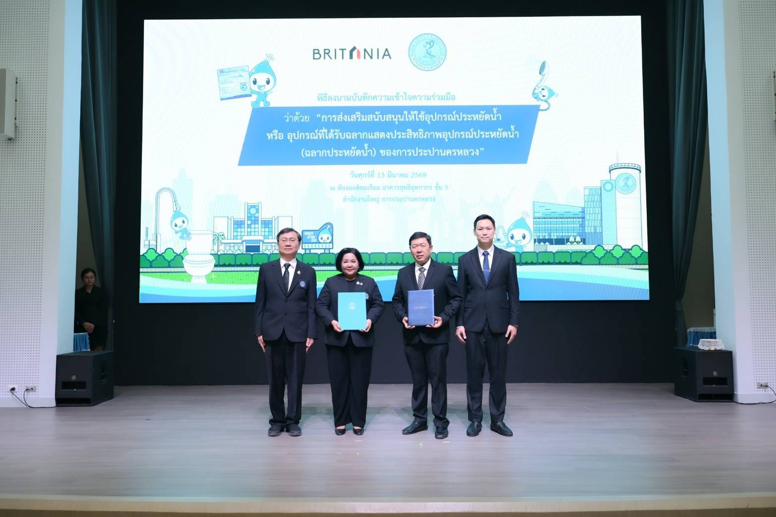 เมื่อวันที่ 13 มีนาคม พ.ศ. 2569 ณ ห้องออดิทอเรียม ชั้น 5 อาคารสุทธิอุทกากร สำนักงานใหญ่ การประปานครหลวง (กปน.) นางสาวสุวรา ทวิชศรี ผู้ว่าการ กปน. พร้อมด้วย นายนาวิน เล็กนาวา ประธานเจ้าหน้าที่บริหารร่วม บริษัท บริทาเนีย จำกัด (มหาชน) และ ดร.สันธยา ชูทรัพย์ รองอธิการบดีฝ่ายบริหาร มหาวิทยาลัยราชพฤกษ์ ร่วมลงนามบันทึกความเข้าใจ (MOU) ว่าด้วยความร่วมมือในการส่งเสริมและสนับสนุนการใช้อุปกรณ์ประหยัดน้ำ หรืออุปกรณ์ที่ได้รับฉลากแสดงประสิทธิภาพอุปกรณ์ประหยัดน้ำ (ฉลากประหยัดน้ำ) ของ กปน. เพื่อผนึกกำลังหน่วยงานภาครัฐ ภาคอสังหาริมทรัพย์ และสถาบันการศึกษา ขับเคลื่อนการใช้น้ำอย่างรู้คุณค่าและอนุรักษ์ทรัพยากรน้ำอย่างยั่งยืน