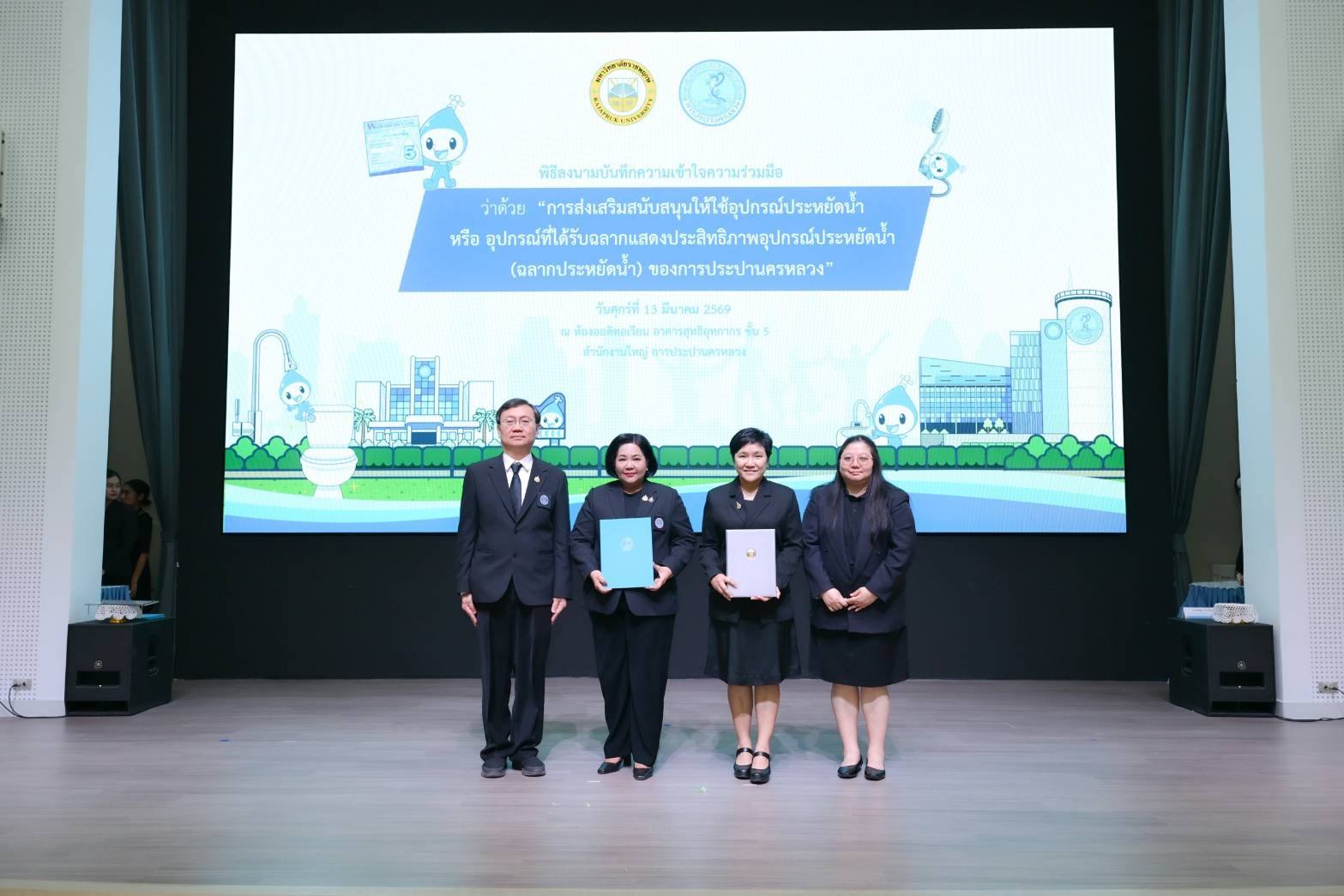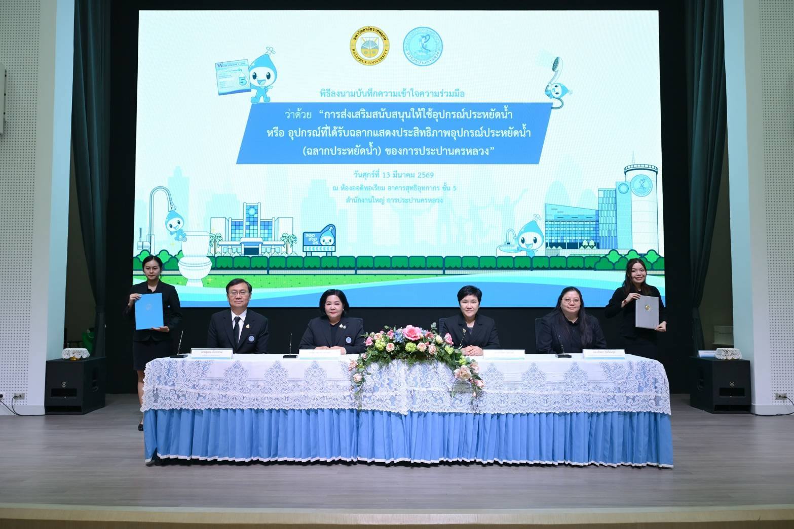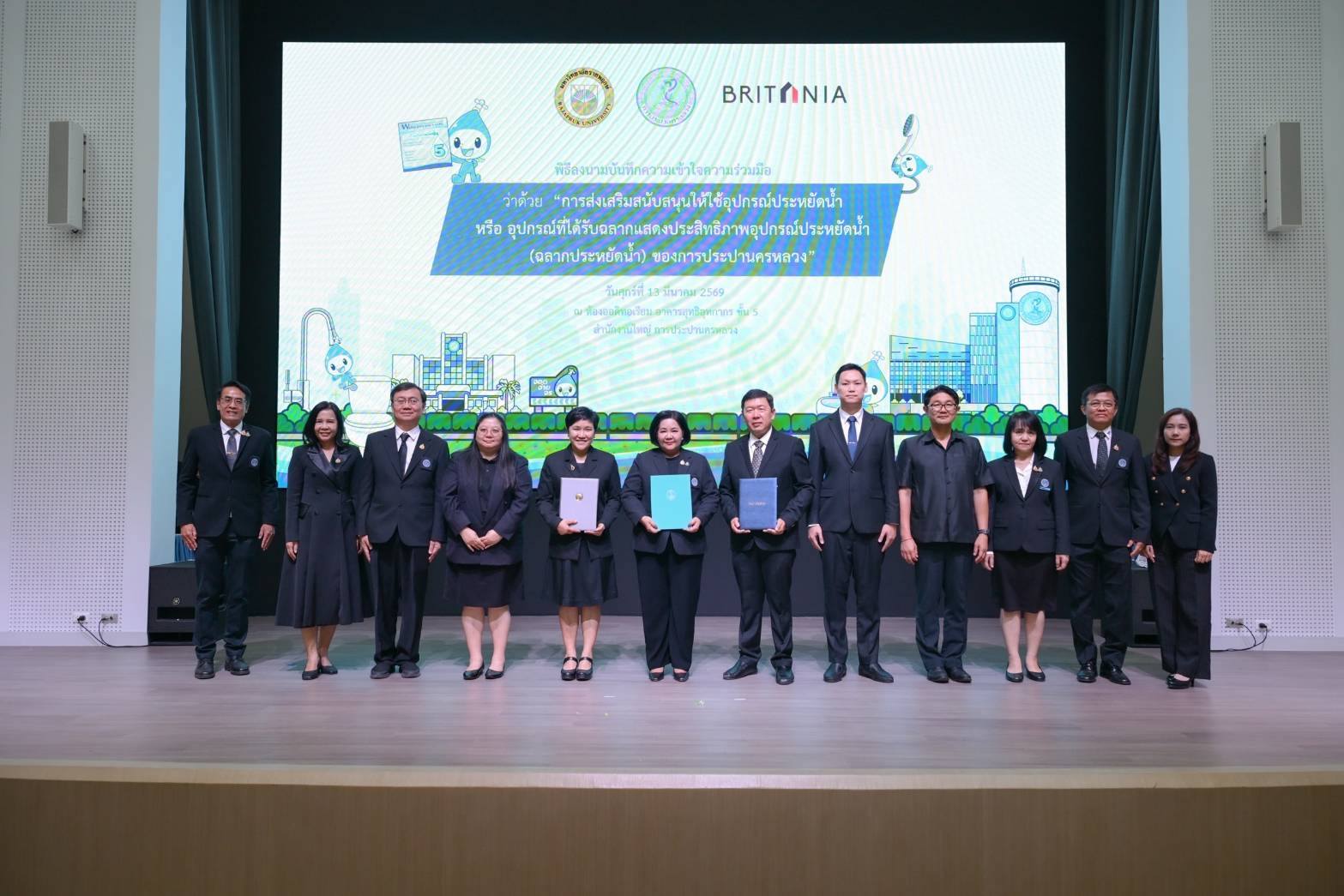 เมื่อวันที่ 13 มีนาคม พ.ศ. 2569 ณ ห้องออดิทอเรียม ชั้น 5 อาคารสุทธิอุทกากร สำนักงานใหญ่ การประปานครหลวง (กปน.) นางสาวสุวรา ทวิชศรี ผู้ว่าการ กปน. พร้อมด้วย นายนาวิน เล็กนาวา ประธานเจ้าหน้าที่บริหารร่วม บริษัท บริทาเนีย จำกัด (มหาชน) และ ดร.สันธยา ชูทรัพย์ รองอธิการบดีฝ่ายบริหาร มหาวิทยาลัยราชพฤกษ์ ร่วมลงนามบันทึกความเข้าใจ (MOU) ว่าด้วยความร่วมมือในการส่งเสริมและสนับสนุนการใช้อุปกรณ์ประหยัดน้ำ หรืออุปกรณ์ที่ได้รับฉลากแสดงประสิทธิภาพอุปกรณ์ประหยัดน้ำ (ฉลากประหยัดน้ำ) ของ กปน. เพื่อผนึกกำลังหน่วยงานภาครัฐ ภาคอสังหาริมทรัพย์ และสถาบันการศึกษา ขับเคลื่อนการใช้น้ำอย่างรู้คุณค่าและอนุรักษ์ทรัพยากรน้ำอย่างยั่งยืน