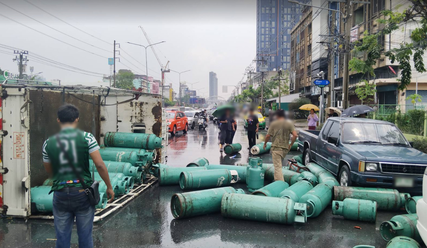 12.40 น. 16 มีนาคม 2569 ระวัง! ฝนตก ถนนเปียกลื่น อุบัติเหตุ รถบรรทุกแก๊สหุงต้ม พลิกตะแคง ถนนสิรินธร ขาออก ลงสะพานข้ามแยกบางพลัดมาเล็กน้อย ก่อนถึงตั้งฮั่วเส็ง ถังแก๊สกระจายเต็มถนน มีผู้บาดเจ็บ