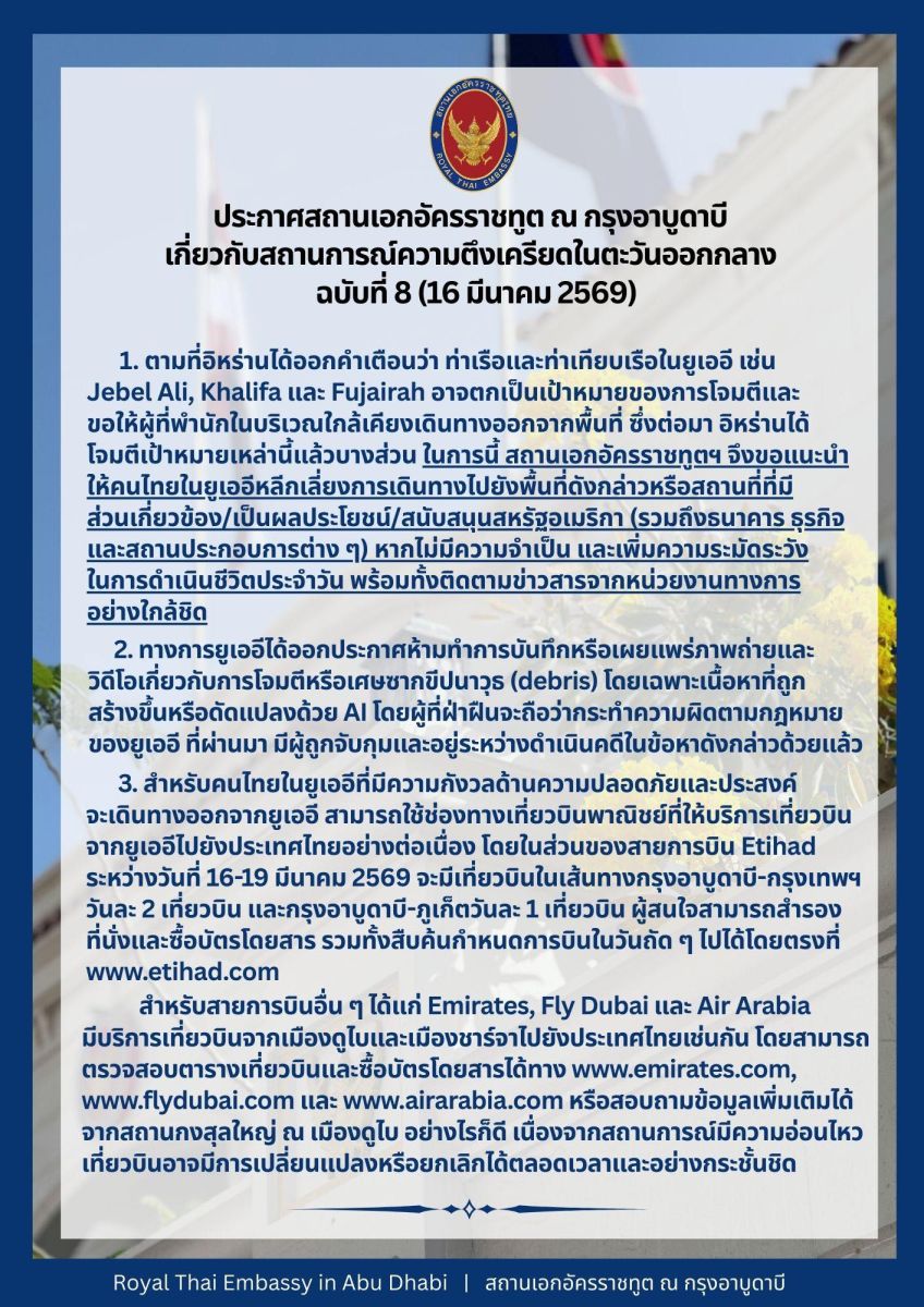 Royal Thai Embassy Abu Dhabi โพสต์แจ้งข่าวผ่านเฟซบุ๊ก ออกประกาศสถานเอกอัครราชทูต ณ กรุงอาบูดาบี เกี่ยวกับสถานการณ์ความตึงเครียดในตะวันออกกลาง ฉบับที่ 8 (16 มีนาคม 2569)