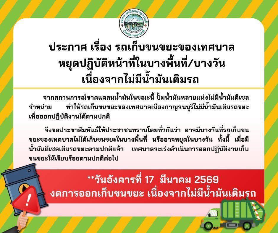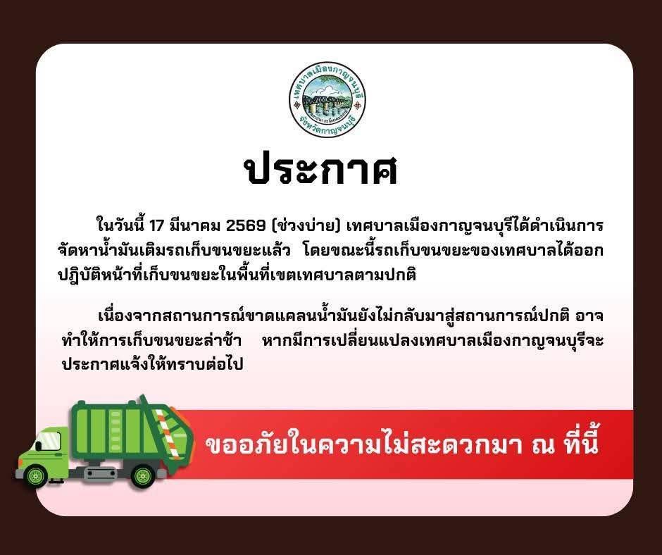 วันที่ 17 มีนาคม 2569 นายวสันต์ ภูษิตกาญจนา นายกเทศมนตรีเมืองกาญจนบุรี ออกมาชี้แจงกรณีการออกประกาศเฝ้าระวังการหยุดจัดเก็บขยะเนื่องจากปัญหาการขาดแคลนเชื้อเพลิง โดยยืนยันว่า ปัจจุบันสถานการณ์กลับเข้าสู่ภาวะปกติแล้ว และประชาชนไม่ต้องกังวลเรื่องปัญหาขยะตกค้าง