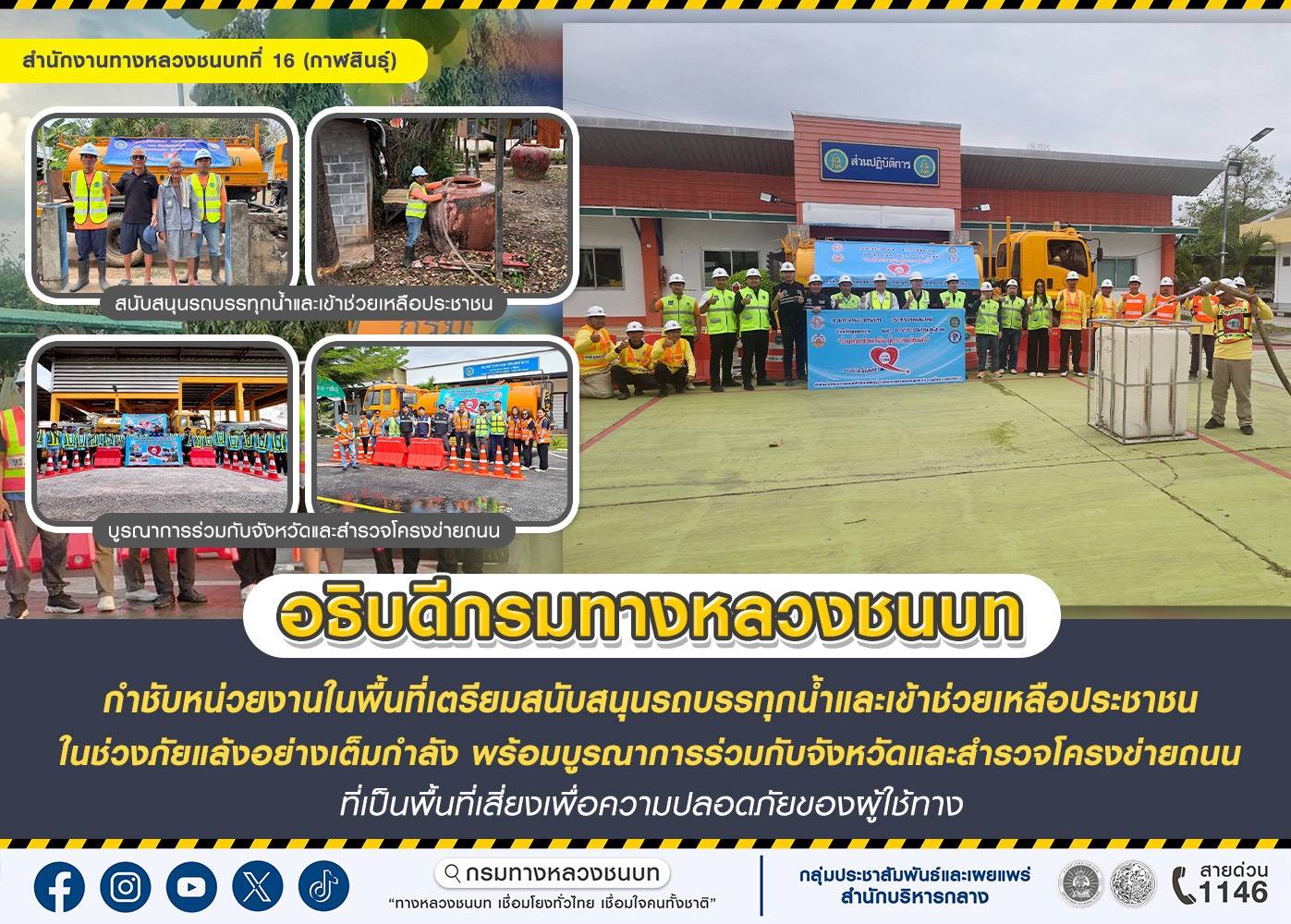 ทั้งนี้ หากประชาชนต้องการความช่วยเหลือสามารถแจ้งได้ที่สายด่วน 1146 หรือแขวงทางหลวงชนบท ในพื้นที่เพื่อทาง ทช.จะได้จัดส่งเจ้าหน้าที่ในการให้ความช่วยเหลืออย่างเร่งด่วนต่อไป
