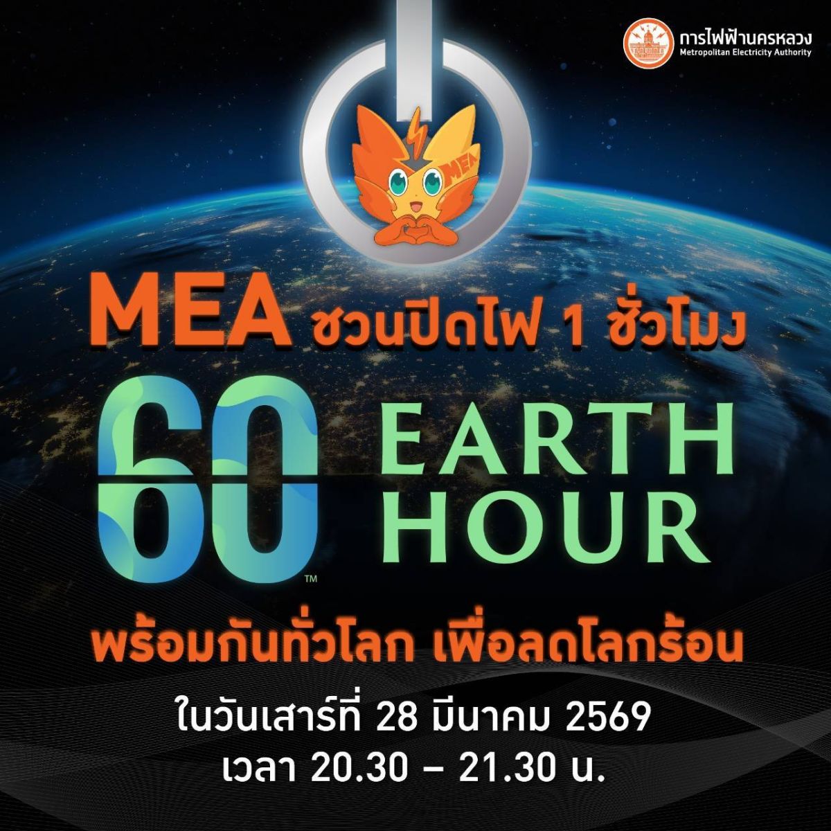 MEA ร่วมกิจกรรม "60 Earth Hour" ชวนปิดไฟ 1 ชั่วโมง พร้อมกันทั่วโลก เพื่อลดโลกร้อน