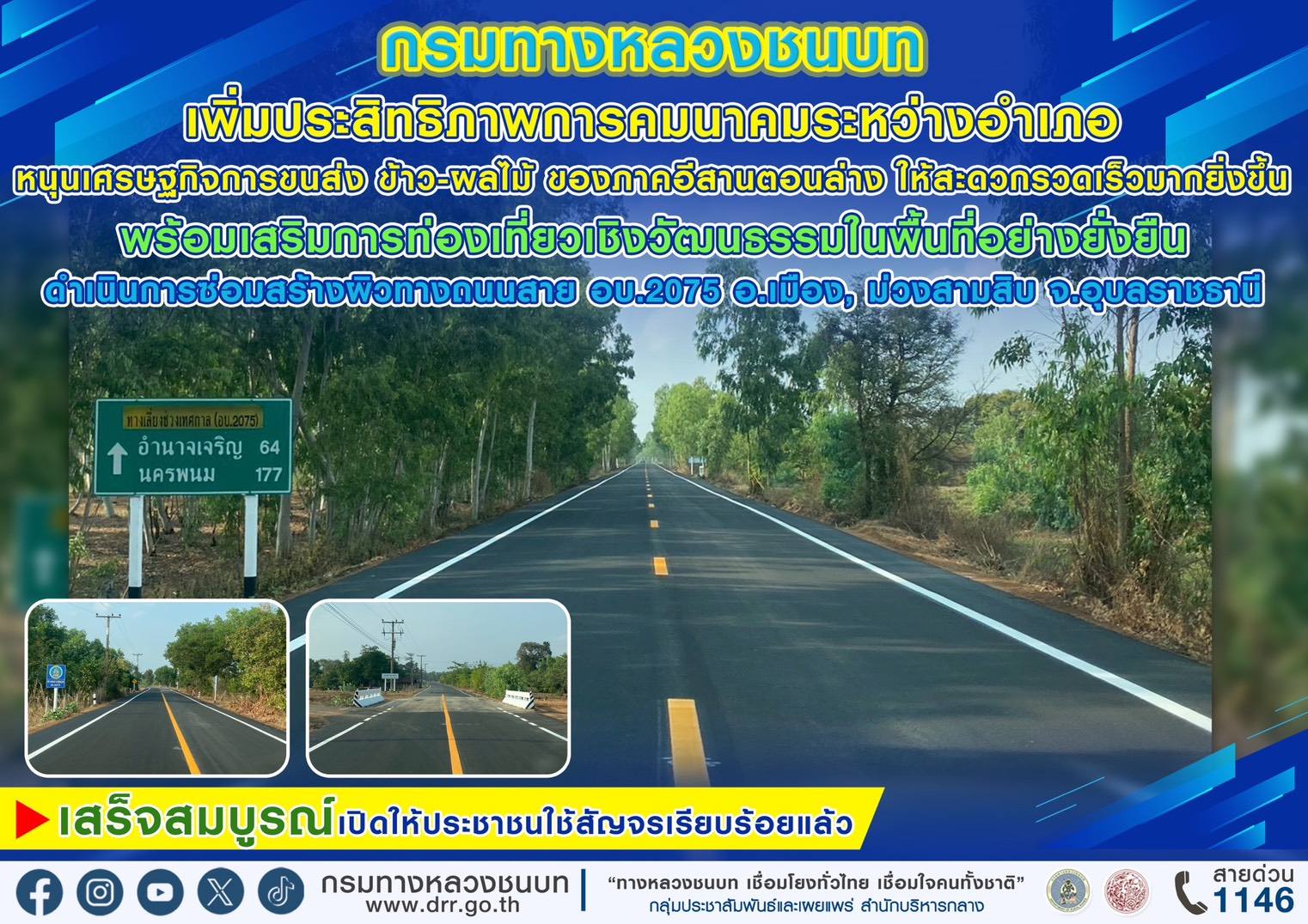 กรมทางหลวงชนบท ซ่อมสร้างผิวทาง ถนนสาย อบ.2075 อ.เมือง, ม่วงสามสิบ จ.อุบลฯ เสร็จสมบูรณ์ เปิดใช้สัญจรแล้วเพิ่มประสิทธิภาพคมนาคมระหว่างอำเภอ หนุนขนส่ง ข้าว-ผลไม้ ภาคอีสานตอนล่าง สะดวกรวดเร็วยิ่งขึ้น