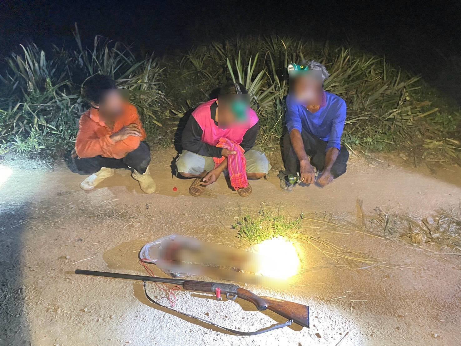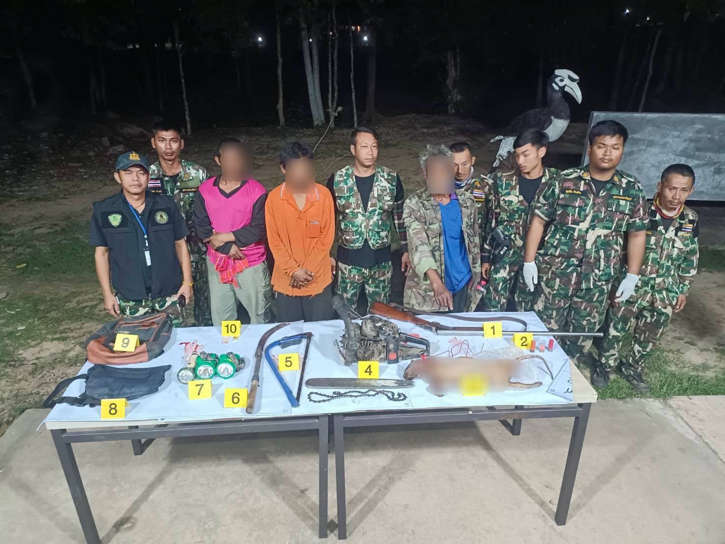 จากการตรวจสอบภายในรถพบชาย 3 คน คือ นายสมพงษ์, นายทวีศักดิ์ และนายวิรัตน์ (สงวนนามสกุลทั้งหมด) พร้อมของกลางรายการสำคัญ ประกอบด้วย ซากแมวดาว (สัตว์ป่าคุ้มครองลำดับที่ 146) จำนวน 1 ซาก อาวุธปืนลูกซองยาวเบอร์ 12 (ยี่ห้อเบลเยี่ยม) 1 กระบอก พร้อมกระสุน 3 นัด และมีดงอ เลื่อยโซ่ยนต์ 1 เครื่อง และเลื่อยมือ 1 อัน ยาบ้าจำนวน 3 เม็ด ไฟฉาย 3 อัน และกระเป๋าสัมภาระ จากการสอบสวนเบื้องต้น นายสมพงษ์ ยอมรับสารภาพว่าเป็นผู้ใช้อาวุธปืนยิงแมวดาวและชำแหละซากในเขตอุทยานฯ จริง ส่วนนายทวีศักดิ์และนายวิรัตน์ (ซึ่งเป็นพี่น้องกัน) อ้างว่าได้รับการว่าจ้างจากนายสมพงษ์ให้มาช่วยตัดไม้ในพื้นที่