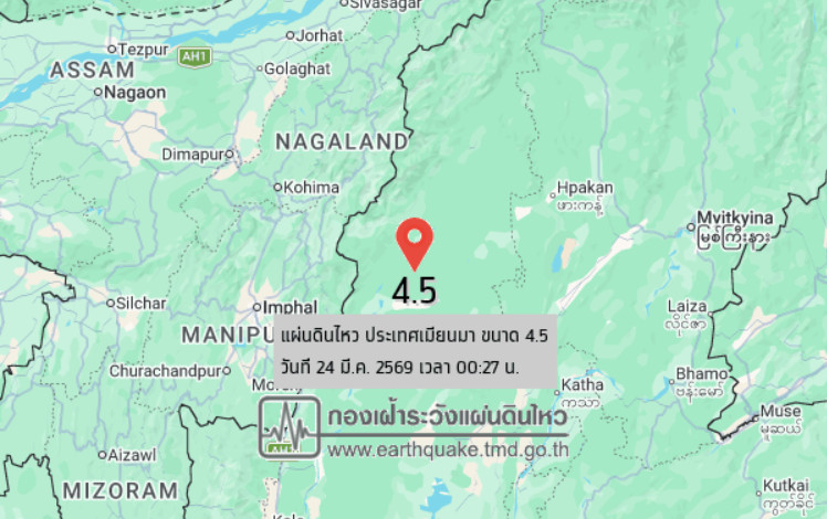 วันที่ 24 มี.ค. 2569 เวลา 00.27 น. กองเฝ้าระวังแผ่นดินไหว กรมอุตุนิยมวิทยา แจ้งเหตุ แผ่นดินไหว ขนาด 4.5 ความลึก 10 กม. ภายในพื้นที่ของ ประเทศเมียนมา(25.05°N,95.19°E) ศูนย์กลางห่างออกไป ทางทิศตะวันตกเฉียงเหนือของ อ.ปางมะผ้า จ.แม่ฮ่องสอน ประมาณ 690 กม. ยังไม่มีรายงานผลกระทบต่อประเทศไทย