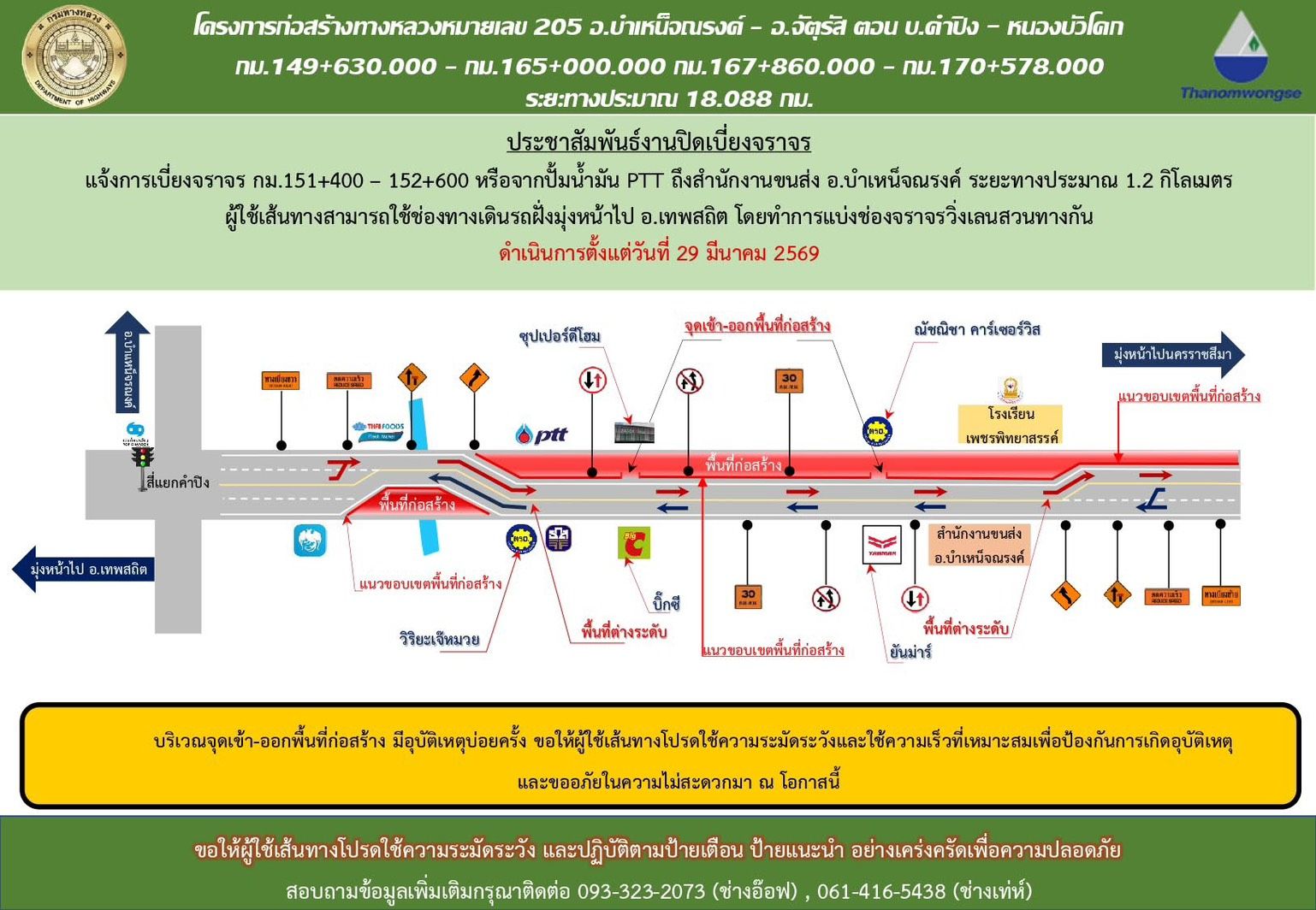 กรมทางหลวง โดยแขวงทางหลวงชัยภูมิ แจ้งว่าได้ดำเนินโครงการก่อสร้างทางหลวงหมายเลข 205 อ.บำเหน็จณรงค์ - อ.จัตุรัส ตอน คำปิง – หนองบัวโคก จังหวัดชัยภูมิ จึงมีความจำเป็นต้องปิดและเบี่ยงจราจรในพื้นที่ดังกล่าว ระหว่าง กม.151+400 - 152+600 (จากปั้มน้ำมัน ปตท. ถึง สำนักงานขนส่ง อ.บำเหน็จณรงค์) ระยะทางประมาณ 1.2 กิโลเมตร ผู้ใช้เส้นทางสามารถใช้ช่องทางเดินรถฝั่งมุ่งหน้าไปอ.เทพสถิต โดยทำการแบ่งช่องจราจรวิ่งเลนสวนทางกัน ซึ่งแขวงทางหลวงชัยภูมิจะเริ่มดำเนินการตั้งแต่วันที่ 29 มีนาคม 2569เป็นต้นไป