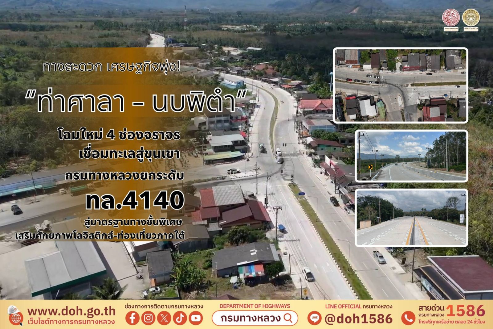 ทางสะดวก เศรษฐกิจพุ่ง! “ท่าศาลา – นบพิตำ” โฉมใหม่ 4 ช่องจราจร เชื่อมทะเลสู่ขุนเขา กรมทางหลวงยกระดับ ทล.4140 เสริมศักยภาพโลจิสติกส์ พัฒนาเศรษฐกิจ หนุนท่องเที่ยวภาคใต้