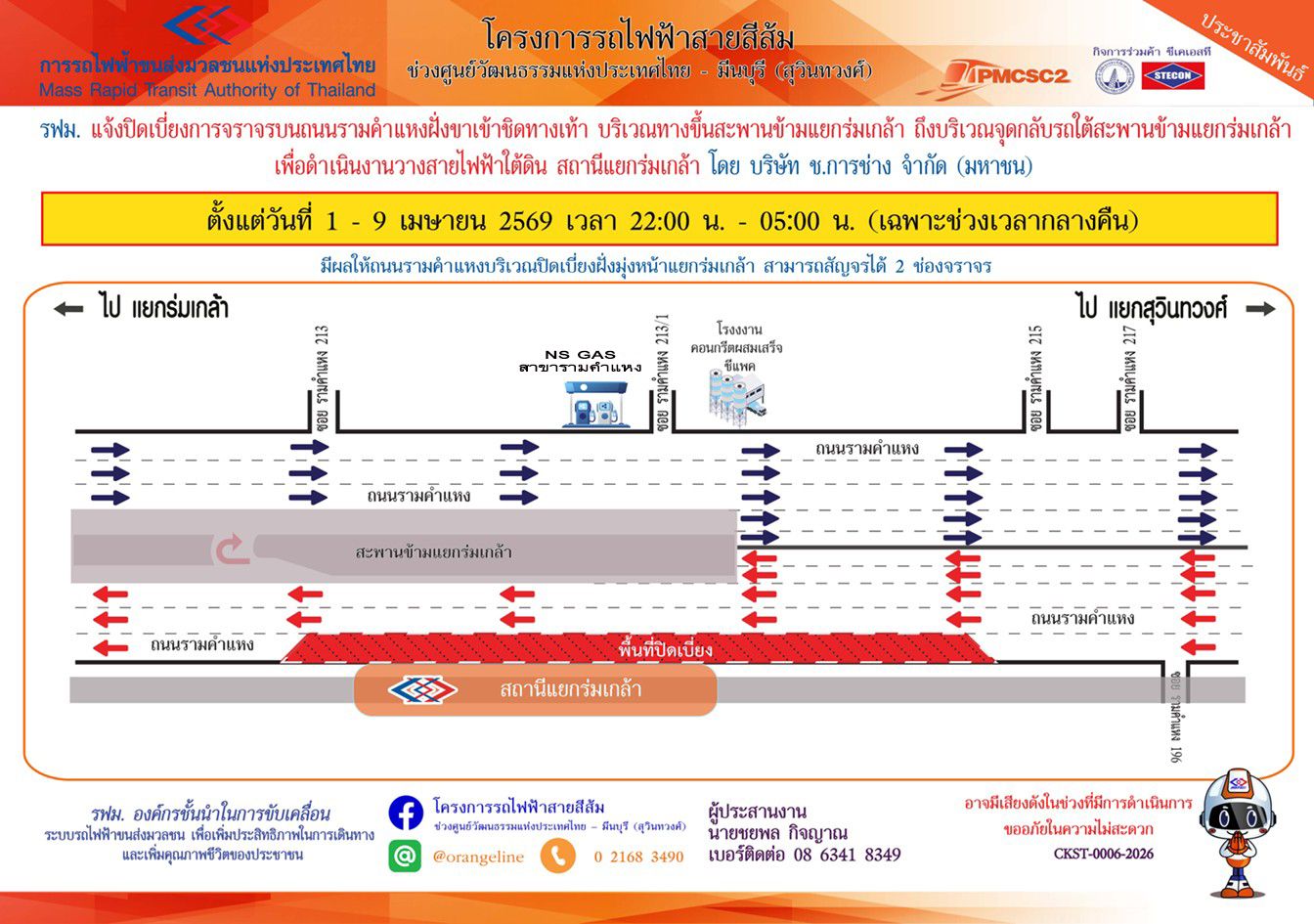 การรถไฟฟ้าขนส่งมวลชนแห่งประเทศไทย (รฟม.) แจ้งว่า บริษัท ช.การช่าง จำกัด (มหาชน) ผู้รับจ้างออกแบบและก่อสร้างงานระบบรถไฟฟ้า โครงการรถไฟฟ้าสายสีส้ม ช่วงศูนย์วัฒนธรรมแห่งประเทศไทย - มีนบุรี (สุวินทวงศ์) มีความจำเป็นต้องปิดเบี่ยงการจราจรบนถนนรามคำแหงฝั่งขาเข้าชิดทางเท้า 1 ช่องจราจร บริเวณทางขึ้นสะพานข้ามแยกร่มเกล้า ถึงบริเวณจุดกลับรถใต้สะพานข้ามแยกร่มเกล้า เพื่อดำเนินงานวางสายไฟฟ้าใต้ดิน สถานี แยกร่มเกล้า ตั้งแต่วันที่ 1 - 9 เมษายน 2569 เวลา 22:00 น. – 05:00 น. (เฉพาะช่วงเวลากลางคืน)