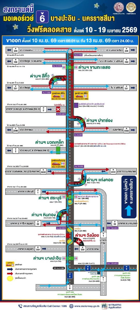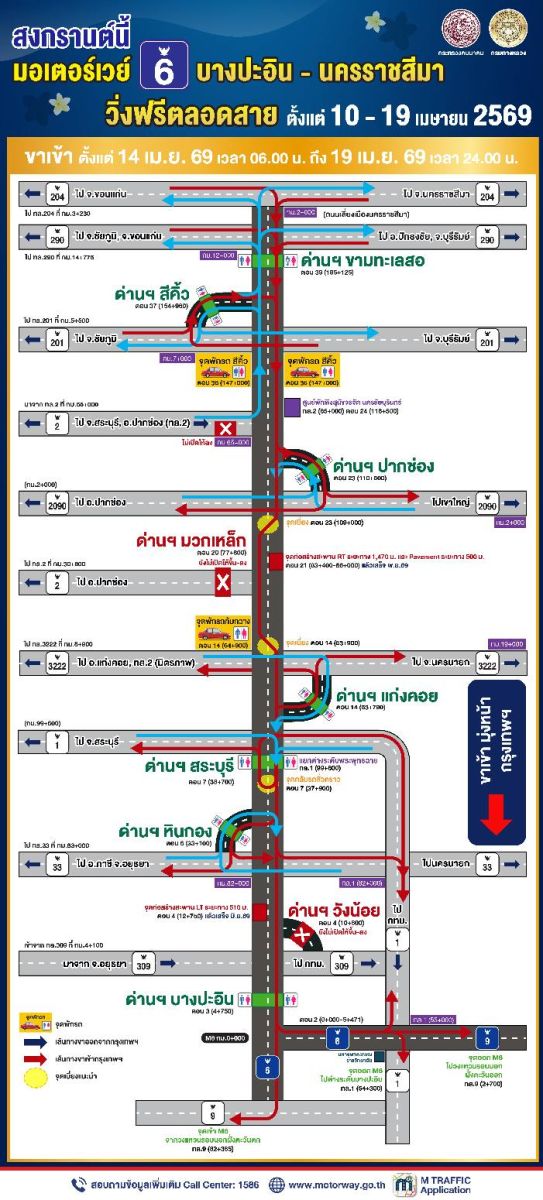 กรมทางหลวง พร้อมอำนวยความสะดวกประชาชน เดินทางกลับภูมิลำเนาและท่องเที่ยวในช่วงเทศกาลสงกรานต์ เปิดให้ทดลองใช้บริการมอเตอร์เวย์ M6 สายบางปะอิน - นครราชสีมา ตั้งแต่วันที่ 10 - 19 เมษายน 2569 เพื่อช่วยระบายการจราจรบนถนนมิตรภาพ โดยมีรายละเอียดการเปิดรับรถดังนี้