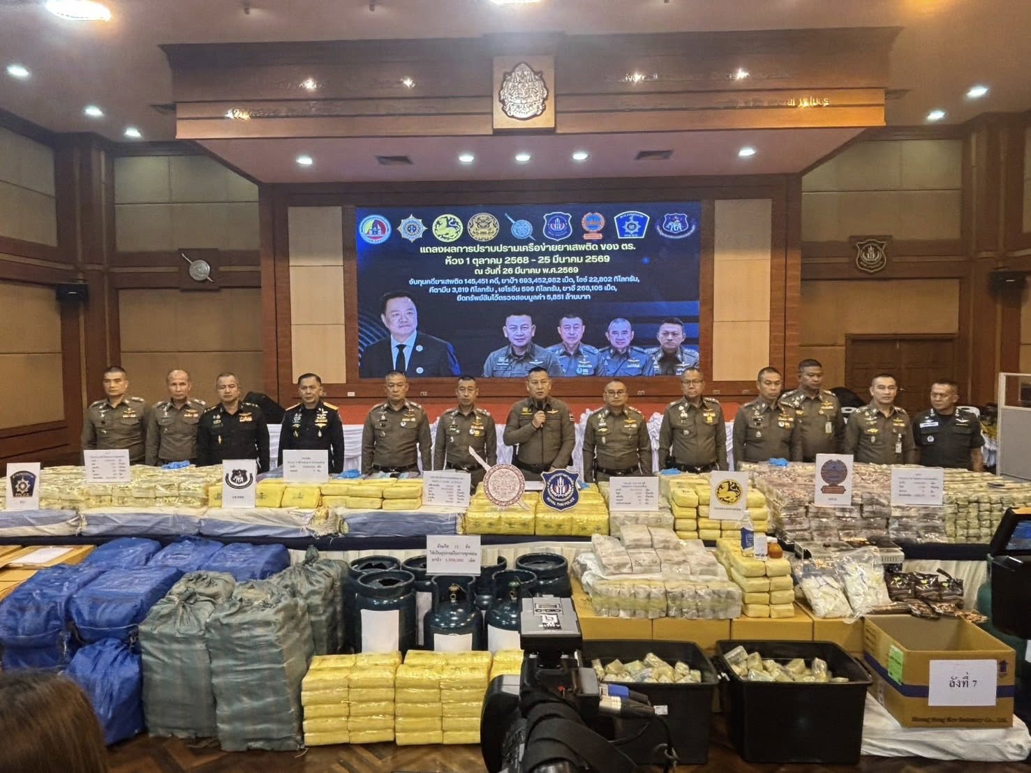 วันนี้ (26 มีนาคม 2569) เวลา 14.00 น. พล.ต.อ.กิตติ์รัฐ พันธุ์เพ็ชร์ ผู้บัญชาการตำรวจแห่งชาติ (ผบ.ตร.) เป็นประธานการแถลงผลการปฏิบัติปราบปรามเครือข่ายยาเสพติดของสำนักงานตำรวจแห่งชาติ (ห้วงวันที่ 1 ตุลาคม 2568 – 25 มีนาคม 2569) ที่กองบัญชาการตำรวจปราบปรามยาเสพติด (บช.ปส.) โดยมี พล.ต.อ.สำราญ นวลมา รอง ผบ.ตร./ผอ.ศอ.ปส.ตร., พล.ต.ท.อาชยน ไกรทอง ผบช.ปส., พล.ต.ท.สยาม บุญสม ผบช.น., พล.ต.ท.กฤตธาพล ยี่สาคร ผบช.ภ.5, พล.ต.ต.ธีรเดช ธรรมสุธีร์ รอง ผบช.น./รอง โฆษก ตร., ผู้แทน บช.ตชด., ผู้แทน สำนักงาน ป.ป.ส. และ ผู้แทน กอ.รมน. โดยบูรณาการทุกหน่วยที่เกี่ยวข้อง เพื่อ “ตัดต้นทาง–ตัดเส้นทาง–ตัดปลายทาง” พร้อมยึดทรัพย์เครือข่ายผู้กระทำผิดอย่างเป็นรูปธรรม