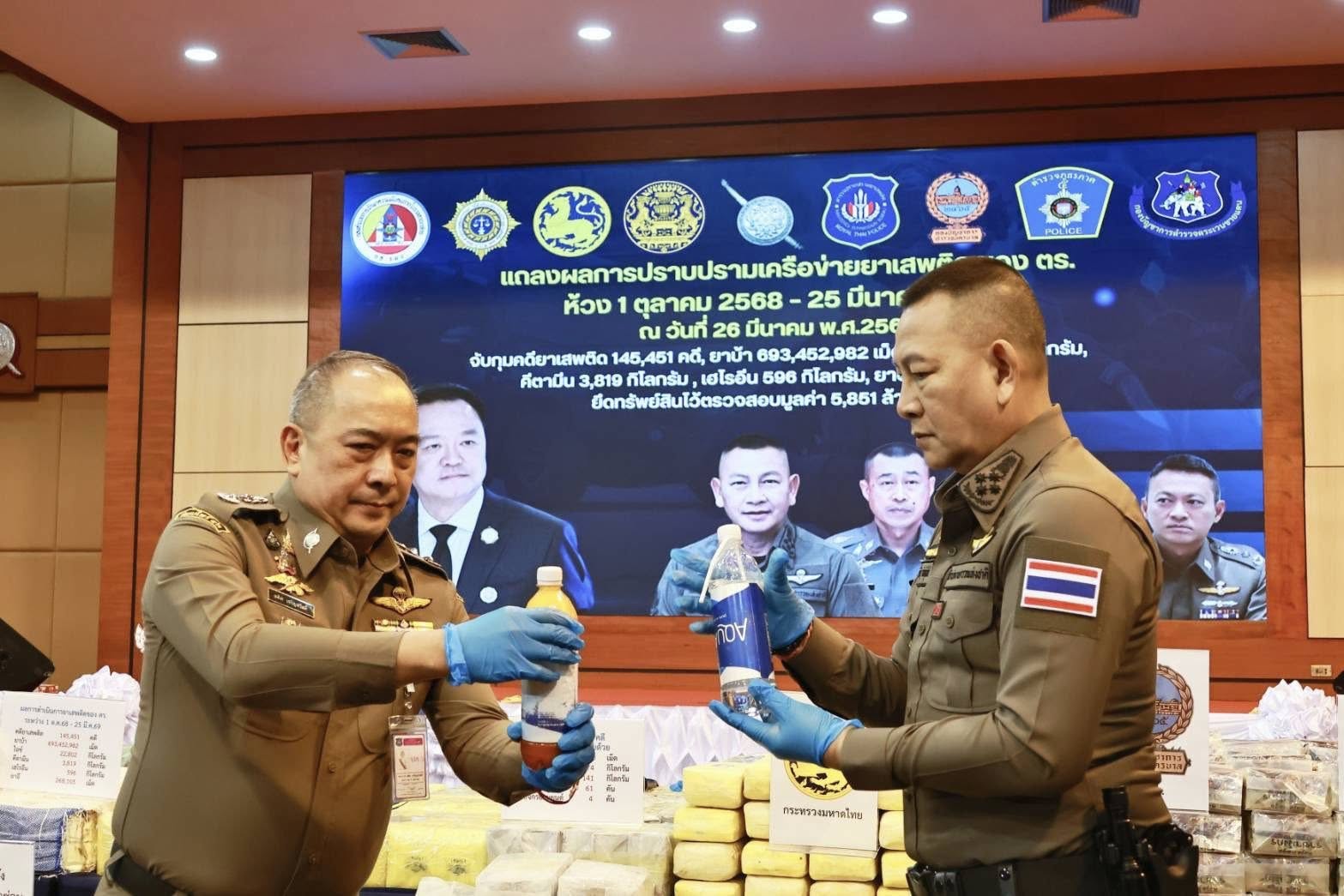 สำนักงานตำรวจแห่งชาติได้ดำเนินการบูรณาการกำลังร่วมกับหน่วยงานที่เกี่ยวข้องอย่างเข้มข้น ระหว่างวันที่ 1 ตุลาคม 2568 – 25 มีนาคม 2569 เพื่อขับเคลื่อนมาตรการปราบปรามยาเสพติดในทุกมิติ ส่งผลให้สามารถจับกุมคดีเกี่ยวกับยาเสพติดได้จำนวน 145,541 คดี พร้อมทั้งตรวจยึดของกลางจำนวนมาก ได้แก่ ยาบ้า 693,452,982 เม็ด, ไอซ์ 22,802.39 กิโลกรัม, เฮโรอีน 596.92 กิโลกรัม, คีตามีน 3,819.07 กิโลกรัม, ยาอี 268,105 เม็ด, และอายัดทรัพย์สินที่เกี่ยวเนื่องกับการกระทำความผิดรวมมูลค่ากว่า 5,851 ล้านบาท
