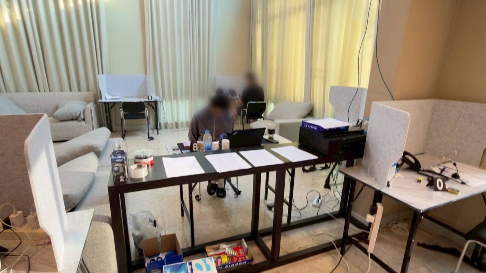 จากการเข้าตรวจค้นออฟฟิศ จำนวน 2 แห่ง พบว่าภายในบ้านถูกดัดแปลงเป็นลักษณะออฟฟิศคอลเซ็นเตอร์ โดยมีการจัดโต๊ะทำงานจำนวน 11 จุด พร้อมอุปกรณ์โทรศัพท์ VoIP, อุปกรณ์กระจายสัญญาณอินเทอร์เน็ต (Router), เครื่องคอมพิวเตอร์ตั้งโต๊ะเปิดหน้าจอค้างอยู่ ซึ่งมีการแสดงผลเป็นข้อความบทสคริปต์, เอกสารสคริปต์วางอยู่ที่โต๊ะ สำหรับพูดหรือพิมพ์เพื่อใช้ในการหลอกลวงทางออนไลน์, รายชื่อเหยื่อชาวเกาหลีใต้พร้อมหมายเลขโทรศัพท์ และเอกสารปลอมแอบอ้างเป็นหนังสือทางราชการของอัยการประเทศเกาหลีใต้