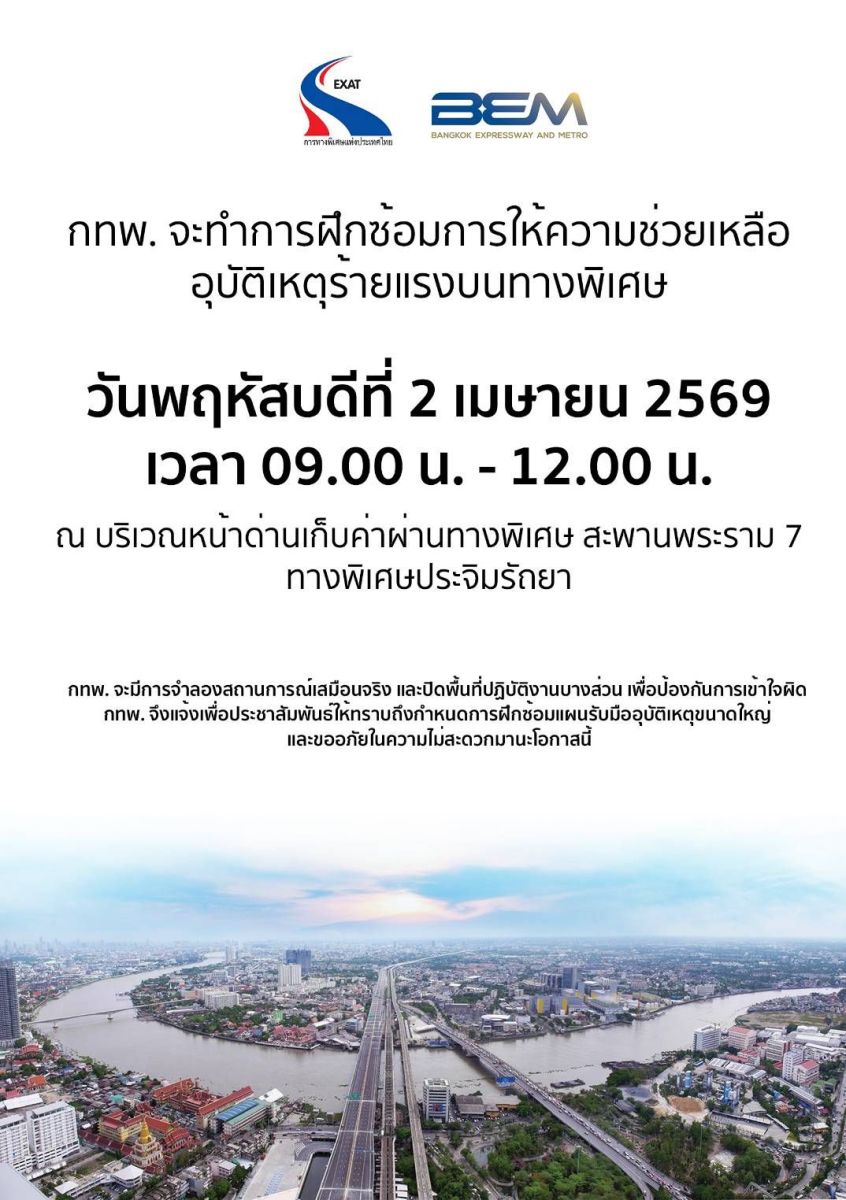 การทางพิเศษแห่งประเทศไทย (กทพ.) ขอแจ้งประชาสัมพันธ์ให้ผู้ใช้บริการทางพิเศษทราบว่า กทพ. ร่วมกับ บริษัท ทางด่วนและรถไฟฟ้ากรุงเทพ จำกัด (มหาชน) (BEM) จะดำเนินการฝึกซ้อมแผนให้ความช่วยเหลือกรณีเกิดอุบัติเหตุร้ายแรงบนทางพิเศษ เพื่อเตรียมความพร้อมในการบริหารจัดการเหตุฉุกเฉิน และเพิ่มประสิทธิภาพในการให้ความช่วยเหลือแก่ผู้ใช้ทางพิเศษอย่างทันท่วงที