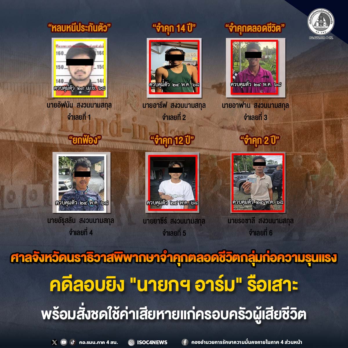 วันที่ 31 มีนาคม 2569 กองอำนวยการรักษาความมั่นคงภายในภาค 4 ส่วนหน้า รายงาน ศาลจังหวัดนราธิวาส อ่านคำพิพากษาศาลชั้นต้น ในคดีหมายเลขดำที่ อ.1006/2568 กรณีเหตุการณ์คนร้ายลอบยิง นายวิเชษฐ์ หรือ "นายกฯ อาร์ม" นายกเทศมนตรีตำบลรือเสาะ เสียชีวิตในพื้นที่อำเภอรือเสาะ จังหวัดนราธิวาส เมื่อวันที่ 7 พฤศจิกายน 2567 ที่ผ่านมา