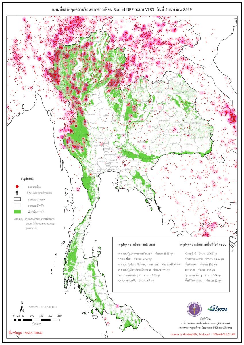 4 เมษายน 2569 สำนักงานพัฒนาเทคโนโลยีอวกาศและภูมิสารสนเทศ (องค์การมหาชน) หรือ GISTDA รายงานข้อมูลจากดาวเทียมซูโอมิ เอ็นพีพี (Suomi NPP) ระบบ VIIRS เมื่อวันที่ 3 เมษายน 2569 พบจุดความร้อนในประเทศไทย 5,052 จุด เพิ่มขึ้นอย่างมีนัยสำคัญจากช่วงก่อนหน้า