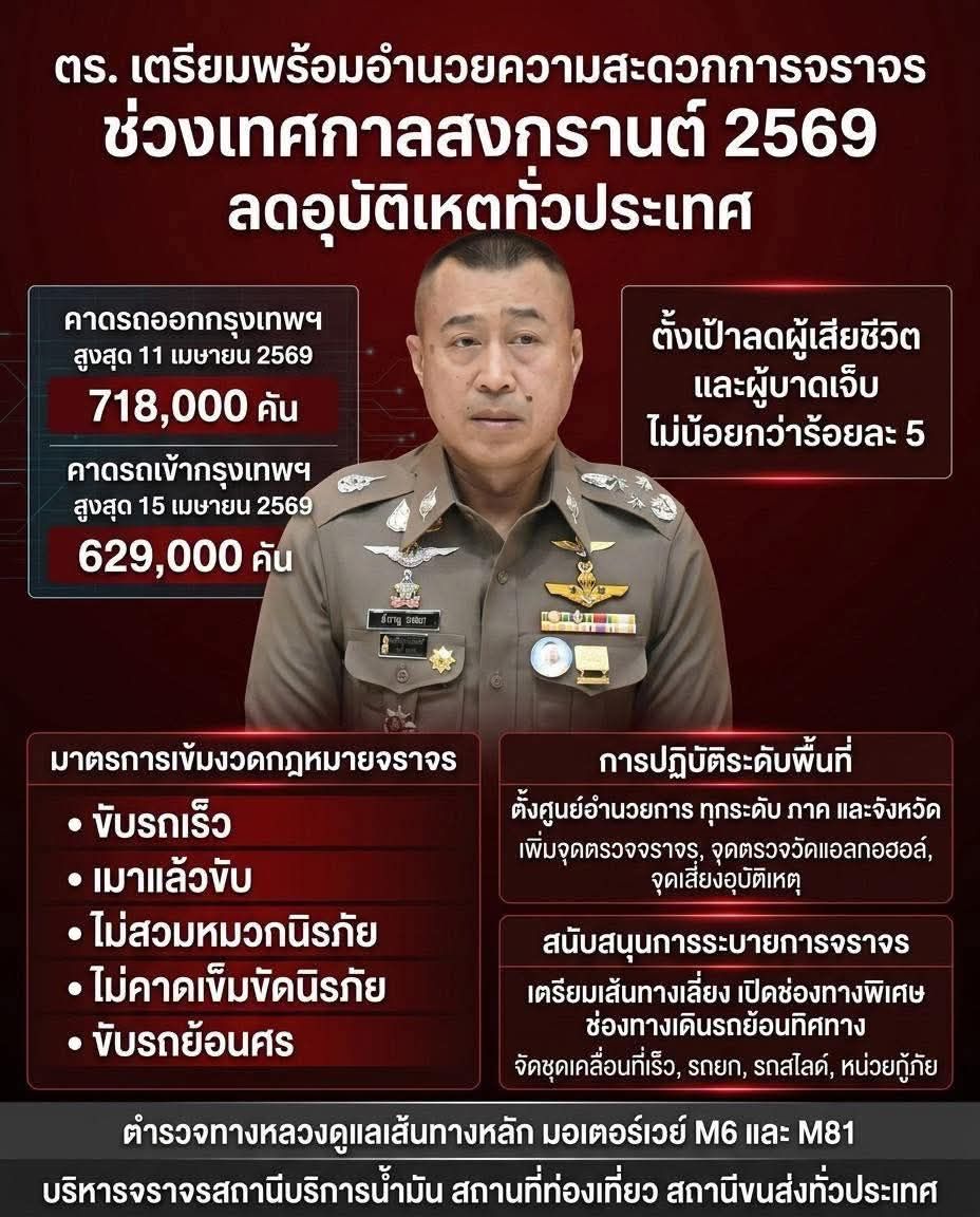 แนะนำประชาชนวางแผนการเดินทางล่วงหน้า เพื่อลดความแออัดบนเส้นทาง เป้าหมายสำคัญ ลดอุบัติเหตุ ผู้เสียชีวิต และผู้บาดเจ็บ ไม่น้อยกว่าร้อยละ 5