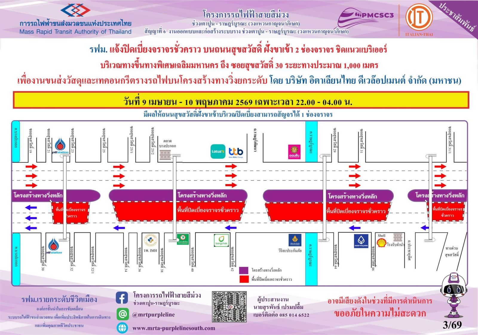 การรถไฟฟ้าขนส่งมวลชนแห่งประเทศไทย (รฟม.) แจ้งว่า บริษัท อิตาเลียนไทย ดีเวล๊อปเมนต์ จำกัด (มหาชน) ผู้รับจ้างงานออกแบบและก่อสร้างระบบรางตลอดแนวเส้นทางโครงการ โครงการรถไฟฟ้าสายสีม่วง ช่วงเตาปูน - ราษฎร์บูรณะ (วงแหวนกาญจนาภิเษก) สัญญาที่ 6 มีความจำเป็นต้องปิดเบี่ยงจราจรชั่วคราว บนถนนสุขสวัสดิ์ ฝั่งขาเข้า 2 ช่องจราจร ชิดแนวแบริเออร์ บริเวณทางขึ้นทางพิเศษเฉลิมมหานคร ถึง ซอยสุขสวัสดิ์ 30 ระยะทางประมาณ 1,000 เมตร เพื่องานขนส่งวัสดุและเทคอนกรีตรางรถไฟบนโครงสร้างทางวิ่งยกระดับ ในวันที่ 9 เมษายน - 10 พฤษภาคม 2569 เฉพาะเวลา 22.00 - 04.00 น. มีผลให้ถนนสุขสวัสดิ์ ฝั่งขาเข้าบริเวณปิดเบี่ยงสามารถสัญจรได้ 1 ช่องจราจร