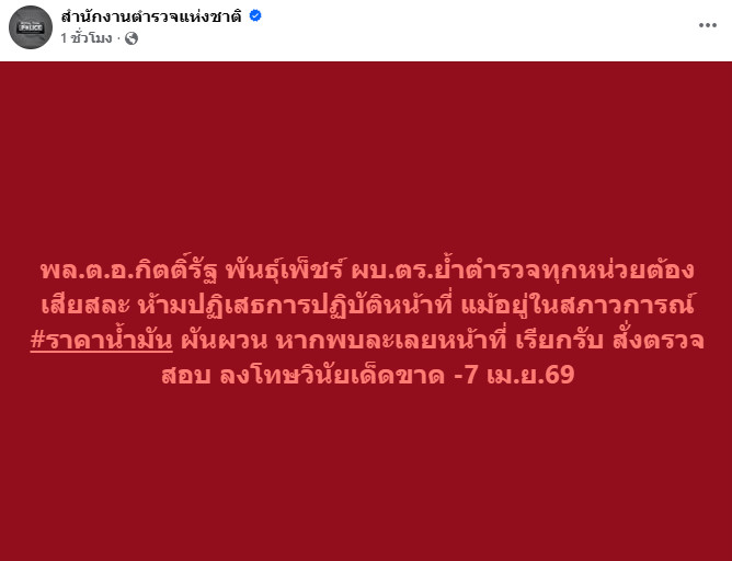 วันนี้ (7 เมษายน 2569) ที่สำนักงานตำรวจแห่งชาติ พล.ต.ท.ไตรรงค์ ผิวพรรณ รองจเรตำรวจแห่งชาติและโฆษกสำนักงานตำรวจแห่งชาติ ให้สัมภาษณ์ถึงกรณีที่มีชาวบ้านร้องเรียนถูกพนักงานสอบสวนสภ.ม่วงสามสิบ จ.อุบลราชธานี เรียกรับค่าน้ำมันแลกกับการเดินทางไปตรวจสอบเหตุคนร้ายลักทรัพย์ในพื้นที่ จน กลายเป็นที่วิพากษ์วิจารณ์ในโลกโซเชียล ทำให้ สำนักงานตำรวจแห่งชาติได้รับความเสียหาย