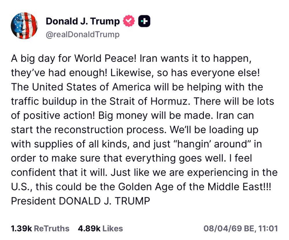 8 เมษายน 2569 สำนักข่าวต่างประเทศรายงานว่าประธานาธิบดีโดนัลด์ ทรัมป์ ของสหรัฐฯ ได้ออกมาโพสต์ข้อความผ่านทางทรูธ โซเชียล ระบุข้อความว่า "เป็นวันสำคัญสำหรับสันติภาพโลก อิหร่านต้องการให้มันเกิดขึ้นพวกเขาทนมามากพอแล้ว เช่นเดียวกัน ประเทศอื่นๆ ก็เช่นกัน สหรัฐอเมริกาจะช่วยจัดการแกปัญหาการจราจรที่หนาแน่นในช่องแคบฮอร์มุซ จะมีการดำเนินการเชิงบวกมากมาย จะมีเงินจำนวนมากถูกสร้างขึ้น อิหร่านสามารถเริ่มกระบวนการฟื้นฟูได้ เราจะขนส่งเสบียงทุกชนิดเข้าไป และจะ 'อยู่เฝ้าดู' เพื่อให้แน่ใจว่าทุกอย่างเป็นไปด้วยดี ผมมั่นใจว่ามันจะเป็นเช่นนั้น เหมือนกับที่เรากำลังประสบอยู่ในสหรัฐฯ นี่อาจเป็นยุคทองของตะวันออกกลาง ประธานาธิบดีโดนัลด์ เจ. ทรัมป์ "