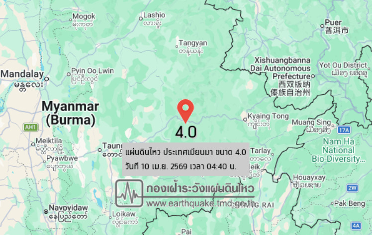เวลา 04.40 น. วันที่ 10 เมษายน 2569 กองเฝ้าระวังแผ่นดินไหว กรมอุตุนิยมวิทยา แจ้งเหตุแผ่นดินไหว ขนาด 4.0 ความลึก 10 กม. ภายในพื้นที่ของประเทศเมียนมา ศูนย์กลางห่างออกไปทางทิศตะวันตกเฉียงเหนือของ อ.ฝาง จ.เชียงใหม่ ประมาณ 160 กม. ยังไม่มีรายงานผลกระทบต่อประเทศไทย