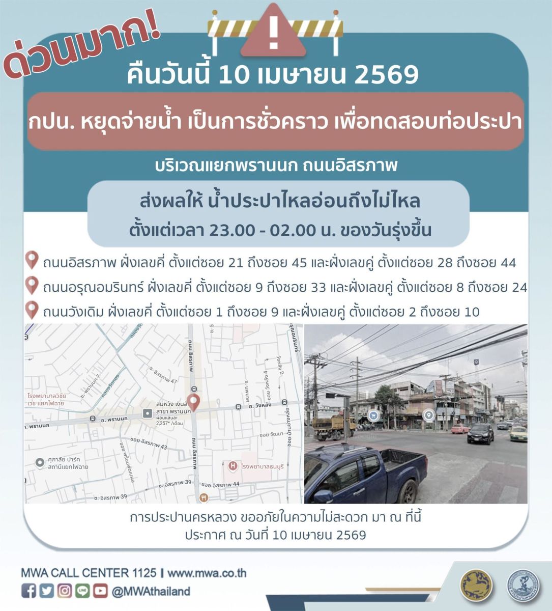 การประปานครหลวง (กปน.) ขอแจ้งให้ทราบว่า จะดำเนินการทดสอบท่อประปาตามแผน ในพื้นที่บริเวณแยกพรานนก ถนนอิสรภาพ เพื่อให้ประชาชนได้รับบริการน้ำประปาอย่างเพียงพอและทั่วถึง จึงมีความจำเป็นต้องหยุดจ่ายน้ำ เป็นการชั่วคราว ในคืนวันนี้ (วันศุกร์ที่ 10 เมษายน 2569) ตั้งแต่เวลา 23.00 - 02.00 น. ของวันรุ่งขึ้น โดยระหว่างดำเนินการ ส่งผลให้ น้ำประปาไหลอ่อนถึงไม่ไหล ในพื้นที่ดังต่อไปนี้