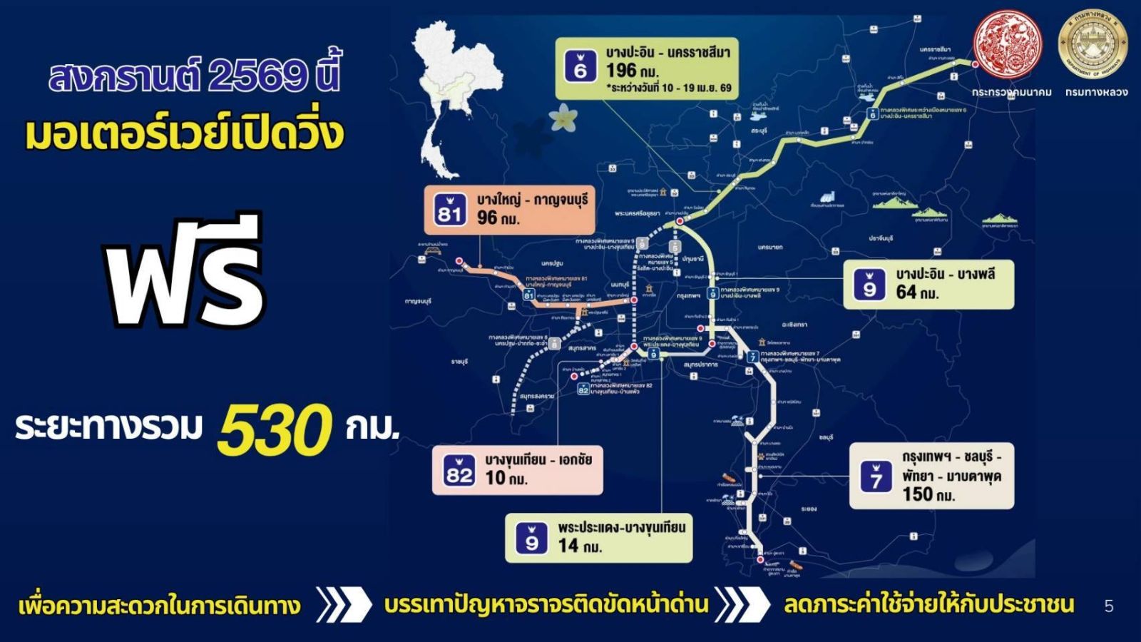 ด้านนายปิยพงษ์ จิวัฒนกุลไพศาล อธิบดีกรมทางหลวง ได้กล่าวรายงานถึงความพร้อมในการอำนวยความสะดวกและปลอดภัยช่วงเทศกาลสงกรานต์ ระหว่างวันที่ 10 - 19 เมษายน 2569 (รวม 10 วัน) โดยกรมทางหลวงได้บูรณาการมาตรการบริหารจัดการใน 4 มิติ ได้แก่ มิติที่ 1 ด้านการเตรียมความพร้อม: บำรุงรักษาผิวทาง ซ่อมแซมไฟฟ้าแสงสว่าง สัญญาณไฟจราจร ป้ายเตือนต่าง ๆ รวมถึงตัดแต่งกิ่งไม้และทำความสะอาดป้ายจราจรให้เด่นชัด พร้อมใช้งาน มิติที่ 2 ด้านการอำนวยความปลอดภัย: วิเคราะห์ข้อมูลสถิติเพื่อป้องกันอุบัติเหตุ แก้ไขจุดเสี่ยง ปิดจุดกลับรถและทางร่วมทางแยกที่อันตราย พร้อมบูรณาการร่วมกับกองบังคับการตำรวจทางหลวงในการกวดขันวินัยจราจร มิติที่ 3 ด้านการอำนวยความสะดวก: จัดตั้งจุดให้บริการทั่วไทย 127 แห่ง, จุดพักรถ 174 แห่ง, หน่วยเคลื่อนที่เร็ว 570 หน่วย และจุดบริการห้องน้ำ 662 แห่ง พร้อมคืนพื้นผิวจราจรในพื้นที่ก่อสร้าง รวมถึงได้มีการยกเว้นค่าธรรมเนียมผ่านทาง 7 วัน (10-16เม.ย. 69) บนมอเตอร์เวย์ 3 สายทาง ได้แก่ M7 (กรุงเทพฯ-ชลบุรี-พัทยา-มาบตาพุด), M9 (บางปะอิน-บางพลี และ พระประแดง-บางขุนเทียน) และ M81 (บางใหญ่-กาญจนบุรี) และเปิดทดลองให้บริการมอเตอร์เวย์ 2 สายทาง ได้แก่ M6 (บางปะอิน-นครราชสีมา) และ M82 (บางขุนเทียน-เอกชัย) มิติที่ 4 ด้านการรายงานเหตุ: จัดตั้งระบบรายงานเหตุด่วน เหตุฉุกเฉิน และอุบัติภัย ให้ผู้บริหารและหน่วยงานที่เกี่ยวข้องรับทราบแบบเรียลไทม์ เพื่อสั่งการและเข้าช่วยเหลือได้ทันที